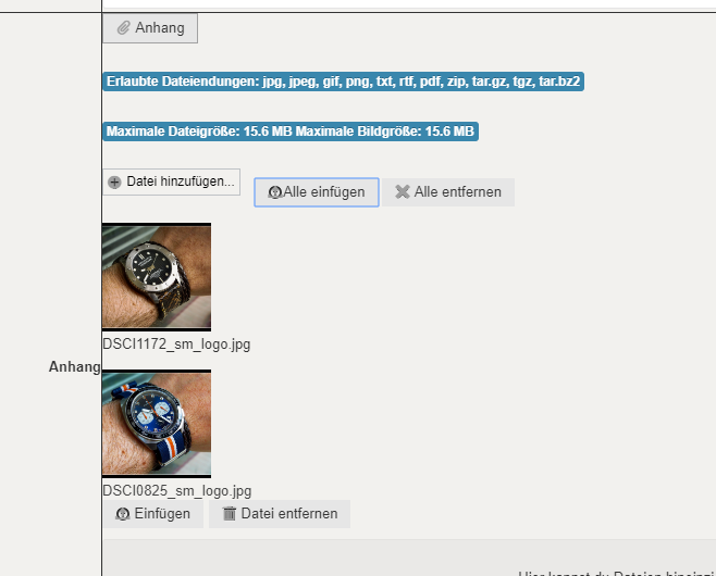 Hm, das ist echt seltsam. Ich könnte mir höchtens vorstellen, dass das eine Bild einen ungültigen MIME-Type aufweist. Ich habe jetzt mal die Überprüfung des MIME-Type abgeschaltet. Bitte versuch doch jetzt noch einmal, das Bild einzufügen.