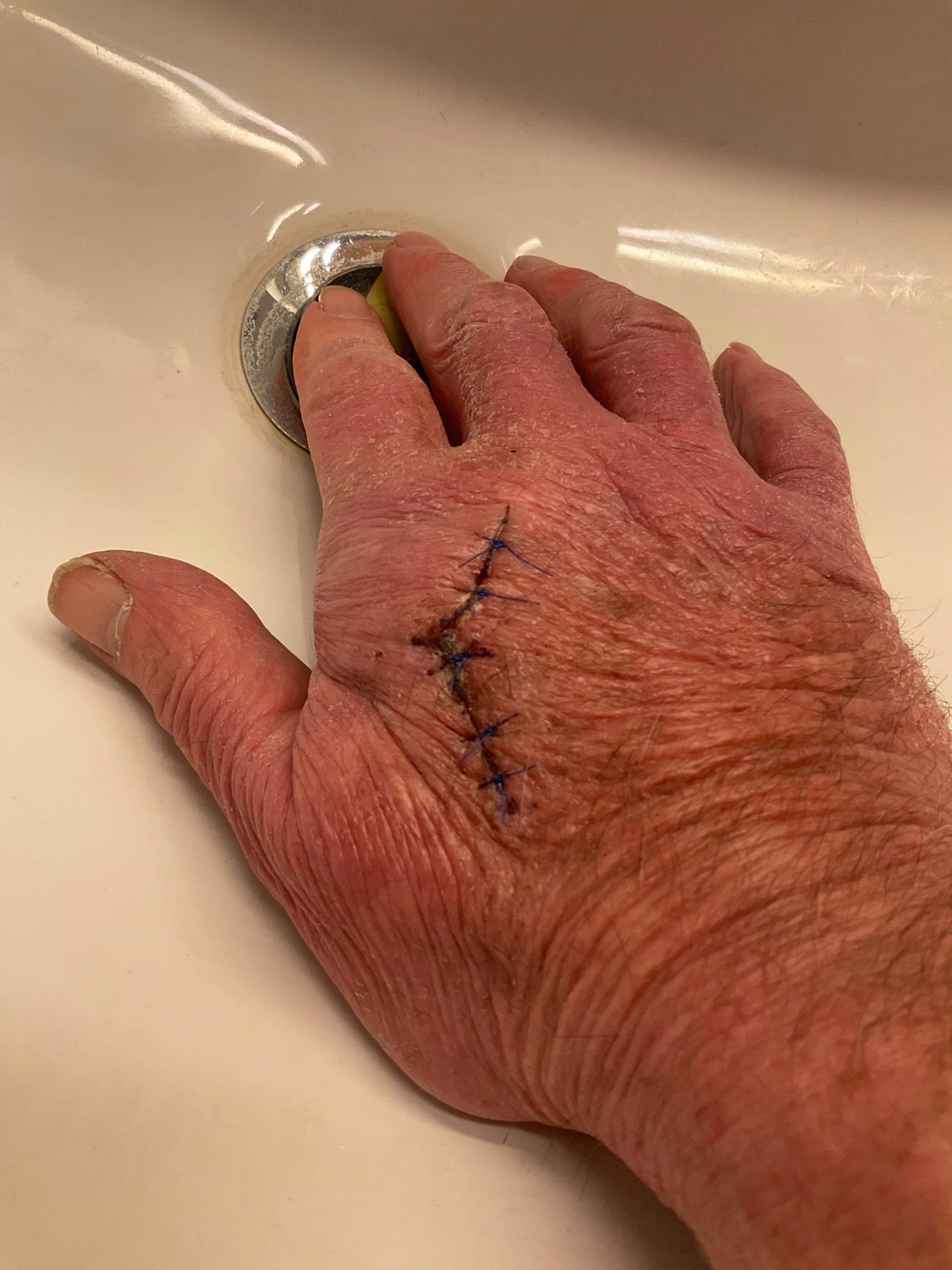 Notarzt gerufen, in die Klinik, Erstversorgung, Wunde erweitert mit Drainage, kein Bett frei, wieder heim, nächsten Tag neue Vorstellumg, alles noch schlimmer! Telefonat, wo ist was frei in einen Krankenhaus? Alles wegen Coronapatienten voll! Endlich am Arsch der Welt in Altperlach, noch Platz.Abends um 11 Uhr Not OP, Handrücken aufgeschnitten, Sehnen, alles durchgespült mit Jodlösung, Am Tropf mit Antibiotika, 3 mal täglich, und meine „guten Venen“, alles zerstochen von „neuen Zugang legen“.