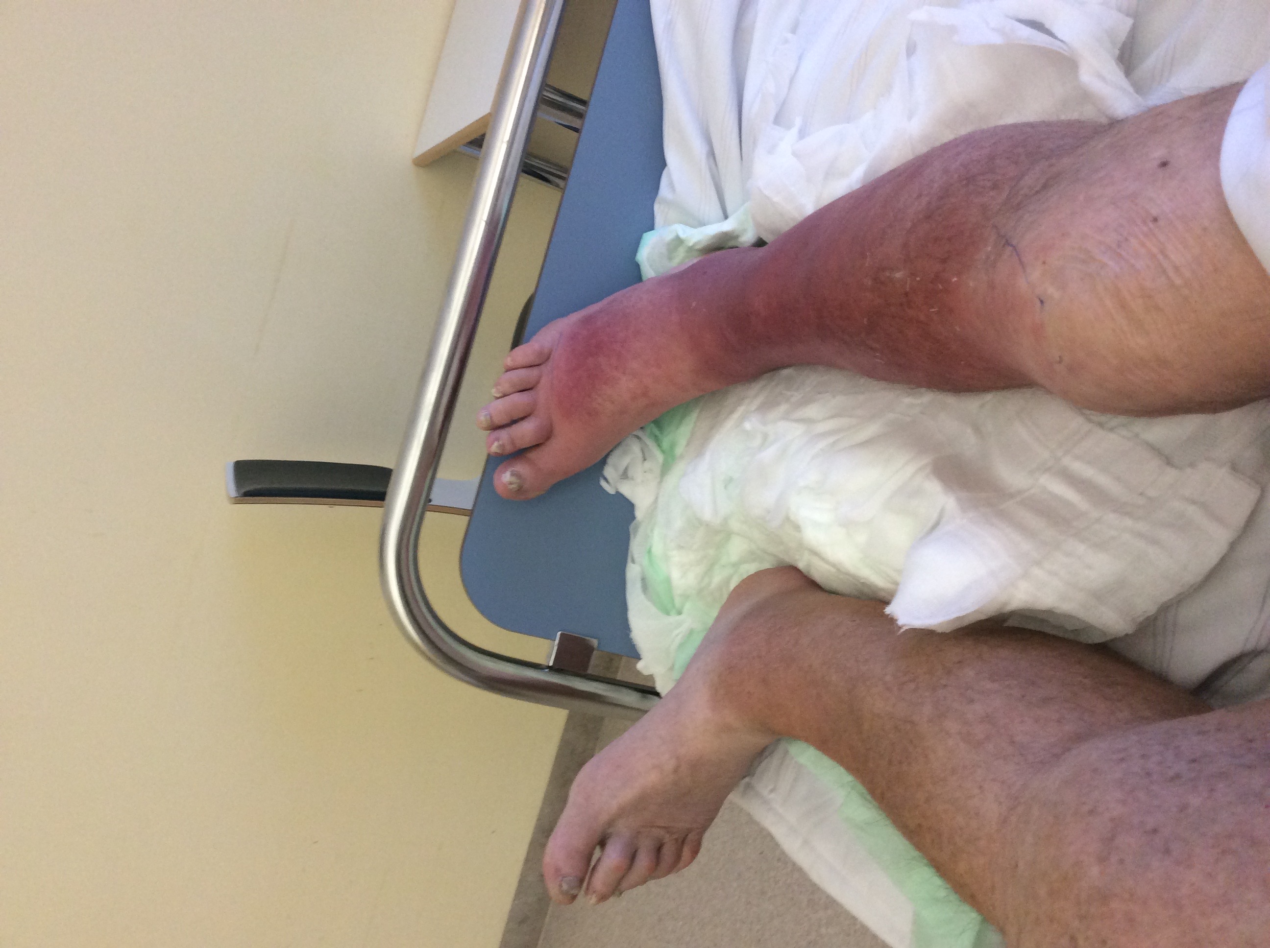 Wie auf den Foto zu sehen, ist der rechte Fuß (Bein) geschwollen und tiefrot verfärbt!