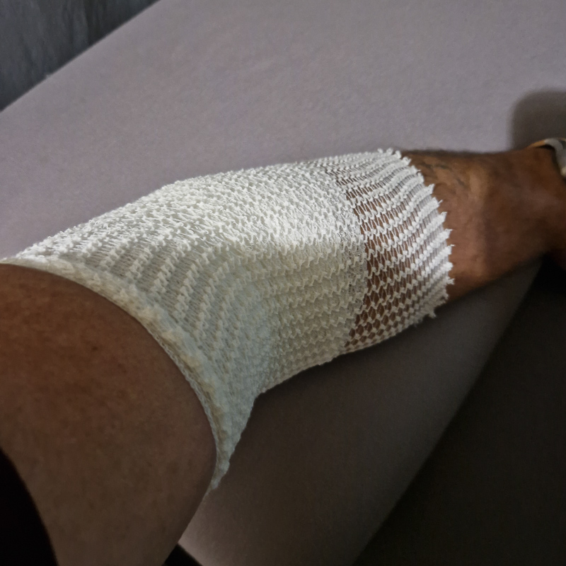 Wunde, Sprühpflaster darüber, Duschen kein Problem, bisher! Diesmal großflächigere Wunde, Pflaster und Sprühpflaster darüber!!!