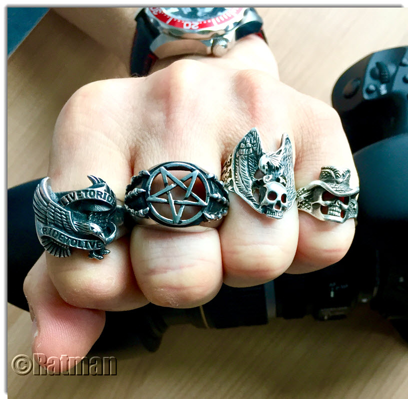 von links nach rechts: Live to ride (Edelstahl), Pentagramm (Edelstahl), Eagle & Skull (Silber), Skull mit Hut (Silber)