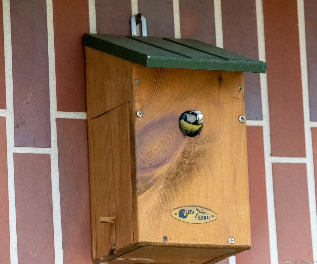 Zum einen hängt der Nistkasten im Schatten und bedingt durch Konverter am langen Ende fehlt das Licht.