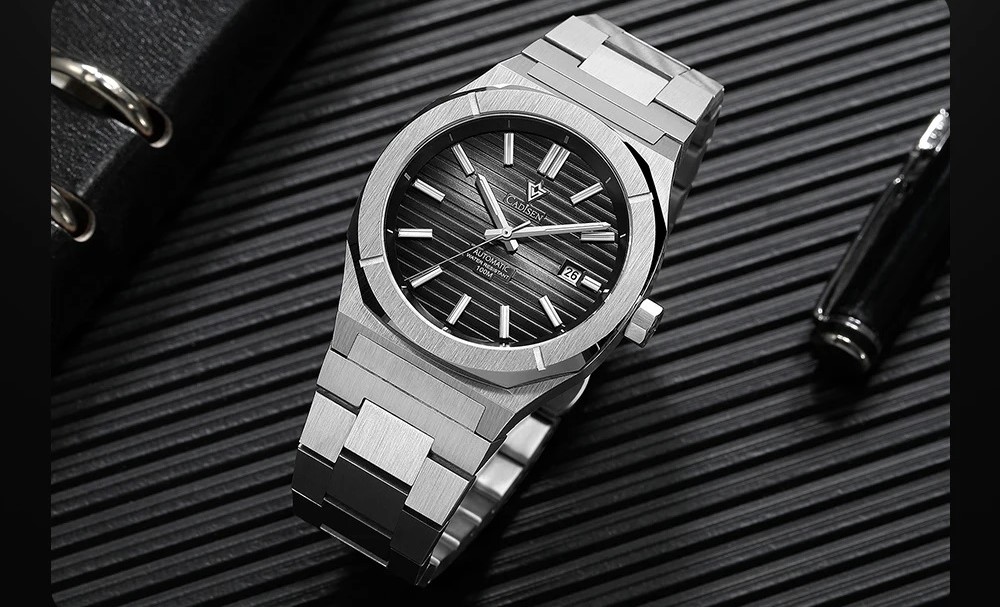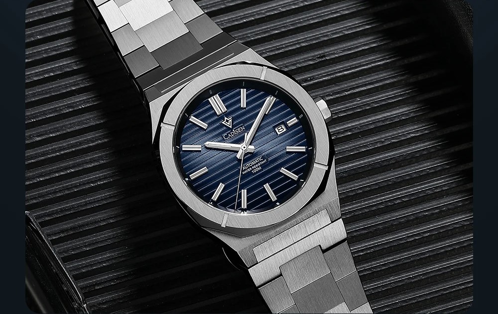 Und hier noch eine günstige Uhr, wo ich schwer am überlegen bin, sie zu kaufen. Eine - wie ich finde - sehr hübsche Cadisen. Ich würde die mit dem blauen Zifferblatt nehmen, das Werk ist ein Miyota 8215, leider hat das Band eine Schmetterlingsschliesse (aber was will man machen). Der Preis ist ein Schnäppchen. Auch die ist von Gentas AP Royal Oak beeinflusst, aber doch nicht zum Verwechseln ähnlich.