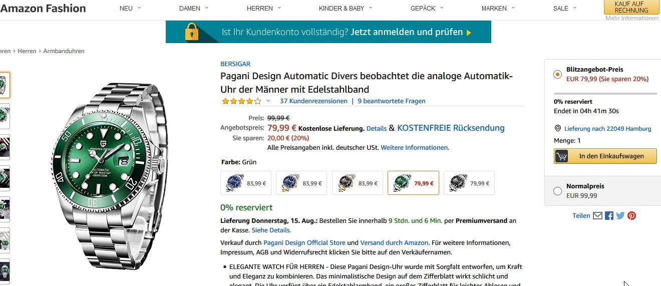 Ich muss gestehen, dass ich auch schon eine Weile um diese Hulk von Pagani herumschwänzle, wie auch generell nach ähnlichen Uhren. Die grüne Tisell von be4real konnte mich noch nicht 100%ig begeistern, auch weil sie preislich in einer anderen Liga spielt. Bei der Pagani musste ich jetzt aber zuschlagen. Ich habe sie aber bei AliExpress bestellt, und zwar ebenfalls beim "PAGANI DESIGN Official Store", also dem gleichen Händler, bei dem du sie über Amazon gekauft hast. Laut Beschreibung ebenfalls mit NH35A und Saphirglas. Bin mal gespannt. Wenn ich Glück habe, bekomme ich die gleiche Uhr wie du für nen Zwanziger weniger. Mit sehr viel Glück sogar ohne Einfuhrabgaben