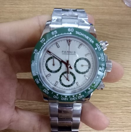 Eben auf AliExpress gesehen: Die Parnis Daytona gibts jetzt auch mit grüner Lünette und hellem Blatt