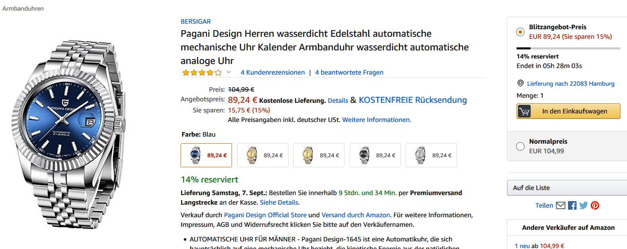 07 Sep. 2019 08:07 - 07 Sep. 2019 08:25Wollte die Uhr vor Jahren eigentlich kaufen, habe es aber jetzt aber erst getan .