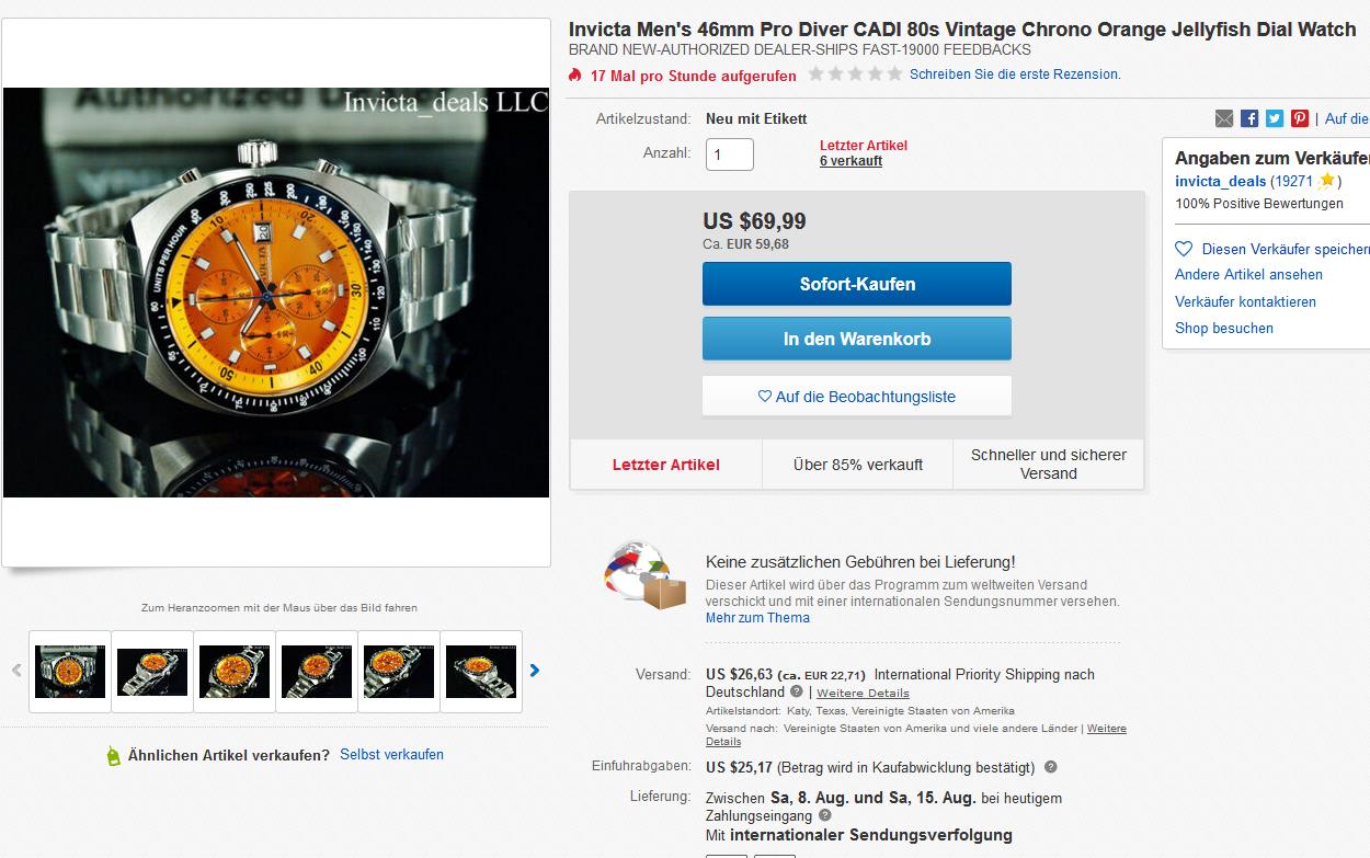 Die Variante mit dem ZB in Orange scheint übrigens weitgehend ausverkauft zu sein. Bei Invicta selbst wird sie jedenfalls als "sold out" gelistet und einige andere Händler in der Bucht können auch nicht mehr liefern.Und bei dem Händler, wo ich sie jetzt bestellt habe, war es wohl das letzte Exemplar