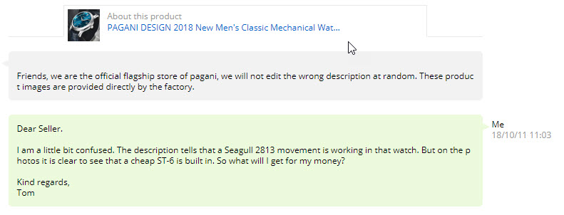 14 Okt. 2018 18:42Ein Nachtrag zur Pagani: Ich hatte nochmal gezielt nachgefragt, welches Werk denn nun tatsächlich drin steckt. Entgegen der Beschreibung steckt kein Seagull 2813 drin, sondern tatsächlich wie auf den Detailfotos ein billiges ST-6. War bei dem Preis ja auch zu erwarten, immerhin kostet ein 2813 ja fast schon soviel wie die ganze Uhr.