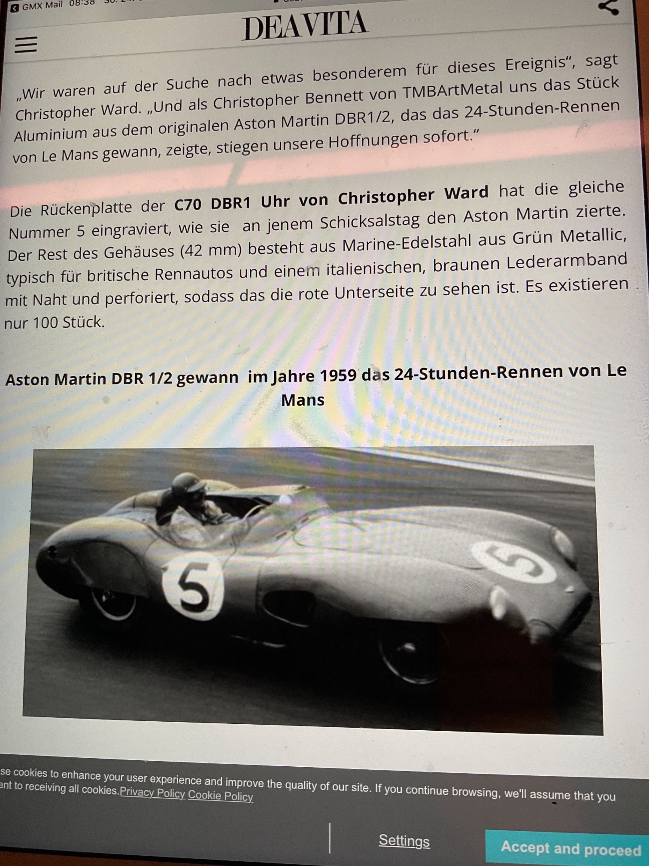 24 Okt. 2021 09:53 - 24 Okt. 2021 11:05Inspiriert durch @ColonelZap und die Uhr die er hier zeigt-das grün übrigens gefällt mir sehr gut, aber der Preis!-habe ich mich mal bei CW umgesehen und ein sehr interessantes Objekt gefunden, deren Rückseite aus einen Stück Alu-Blech vom Astin Martin - der das 24 Stunden Rennen von Le Mans 1959 gewann - besteht. Übrigens der einzige Sieg von A.M., und das Styling des Rennwagens finde ich wunderbar! Das ist mit ein Grund, das mich die Rennen vergangener Tage so faszinieren! Wie ich gelesen habe, wurde der A.M. für 20 Millionen £ versteigert! Und das Blech für die Uhren wurde während der Restauration entnommen. Übrigens die Uhr ist auf 100 Stück limitiert! Wer das nötige „Kleingeld“ hat zugreifen, wenn sie nicht schon vergriffen ist!!Die B.R.M. sind ja der Knaller, die würden mir auch gefallen!!!