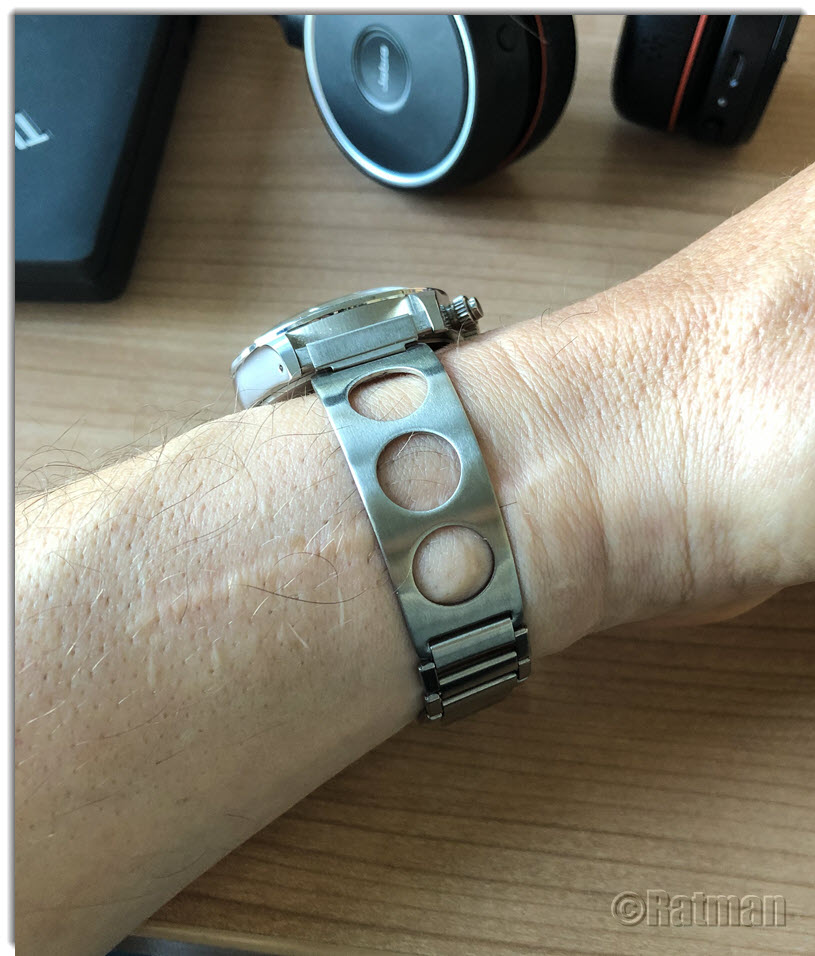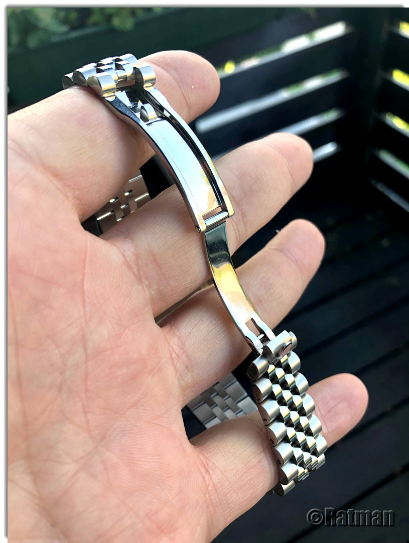Um Probleme zu vermeiden, habe ich dem Händler nach der Bestellung geschrieben, er möge mir die Bänder bitte ohne Logo zusenden. Sowohl das Band selbst als auch die Endlinks sind massiv, Federstifte liegen bei, auch ein preiswertes Federsteg-Werkzeug hatte der Händler beigelegt. Gegenüber billigeren Jubilees wirkt dieses Band deutlich weniger "schlabberig", die Verarbeitung ist durchweg gut. Unterschiede konnte ich nur beim Kraftaufwand für das Öffnen der Schließe ausmachen. Ein Band öffnete sich schon bei relativ geringem Zug am Hebel, bei einem zweiten muss ich schon etwas energischer ziehen.