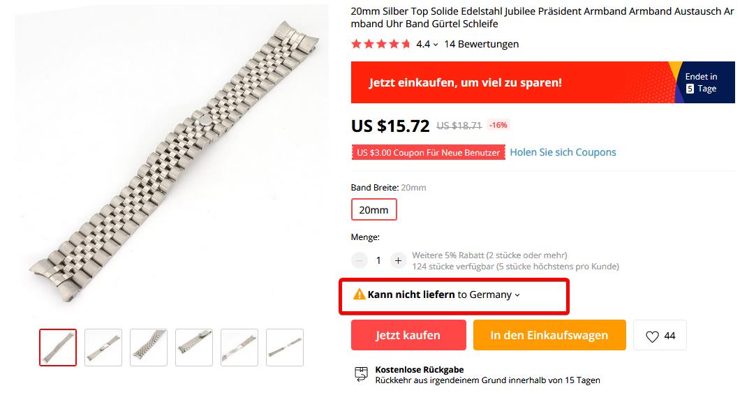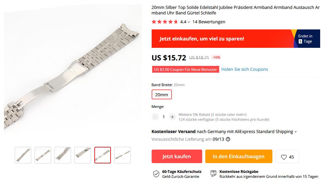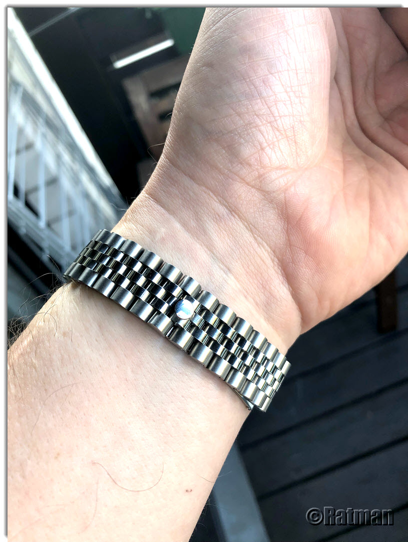 So, dann will ich auch mal was beitragen. Ich hatte mir vor einiger Zeit bei einem Händler bei AliExpress drei Bänder im Jubilee-Style bestelt. Ich war ein wenig skeptisch wegen des Preises von rund 15,- EUR pro Stück sowie dem Hinweis in der Anzeige, dass das Band mit oder ohne Logo erhältlich sei. Da unklar war, welches Logo der Händler meint, habe ich ihn kurz angeschrieben. Er teilte mir mit, dass das Band auch mit "Krönchen" erhältlich sei :