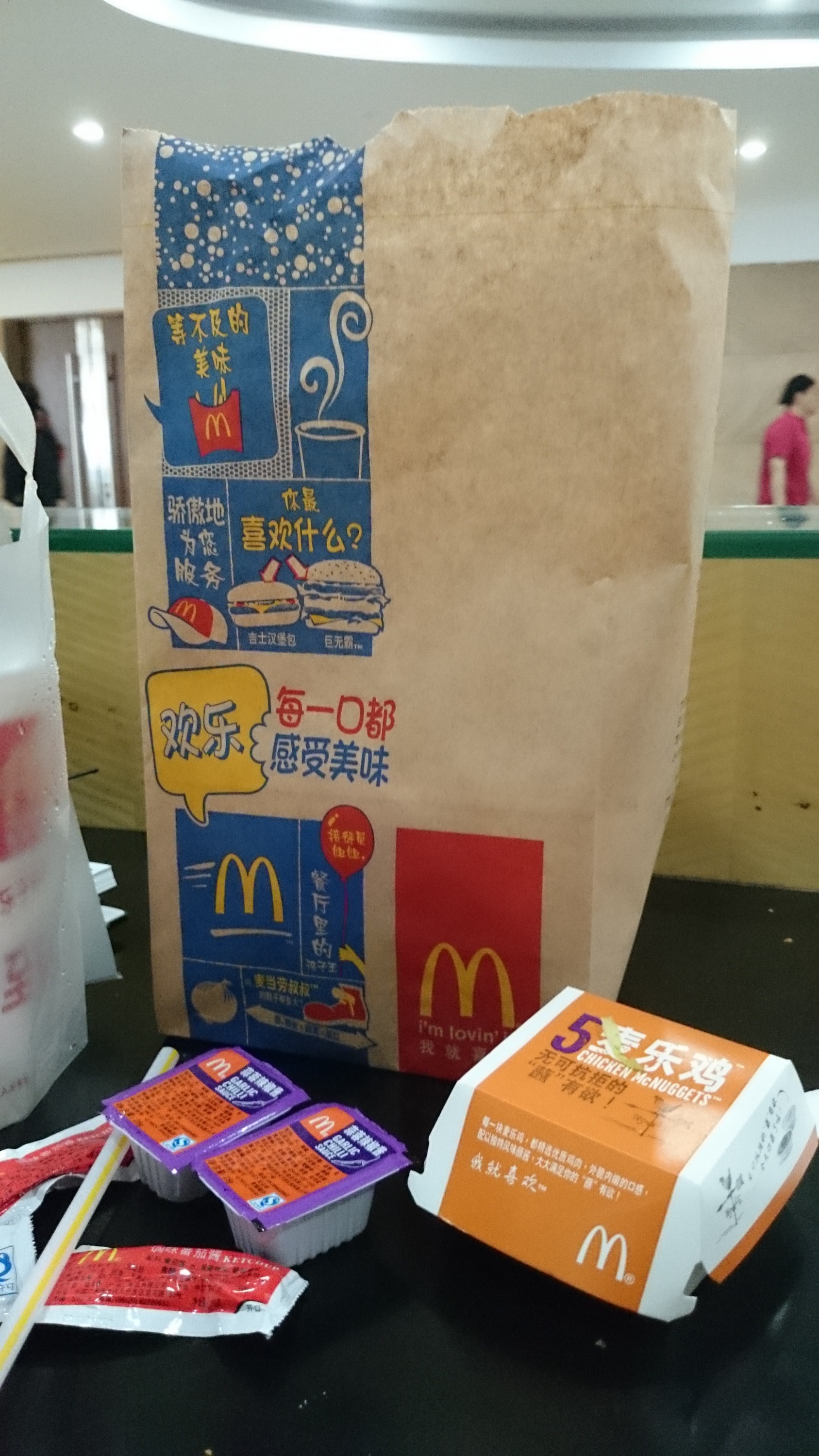 Nun denkt aber mal nicht, dass es den Royal TS mit Käse gibt. Es gab irgendeinen Burger mit einer grünen unbekannten Masse, dann noch etwas mit etwas fischigem. Beides nicht meines, also das, was man kennt: Nuggets ... Das einzige Produkt, was man wiedererkennen konnte.