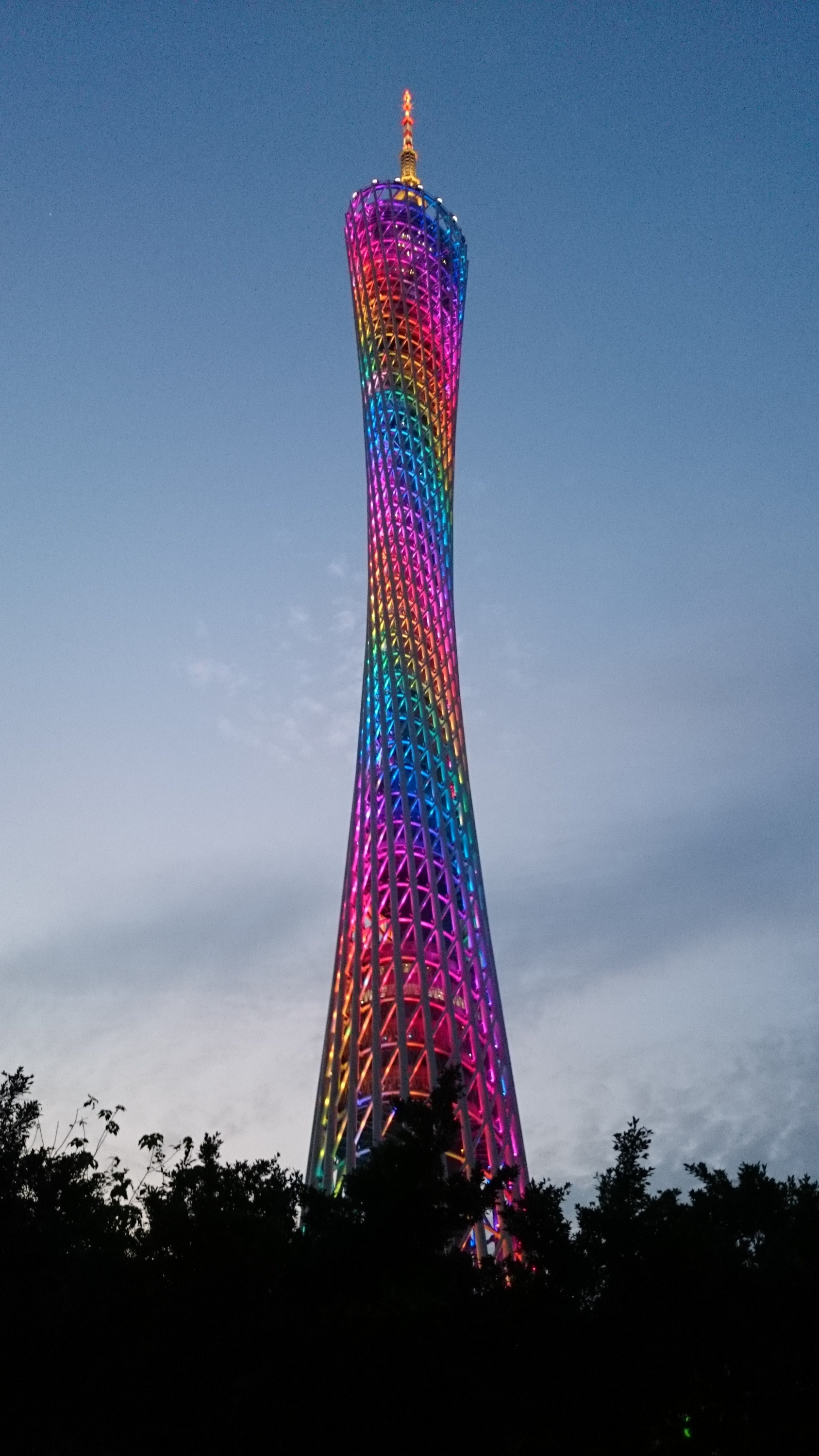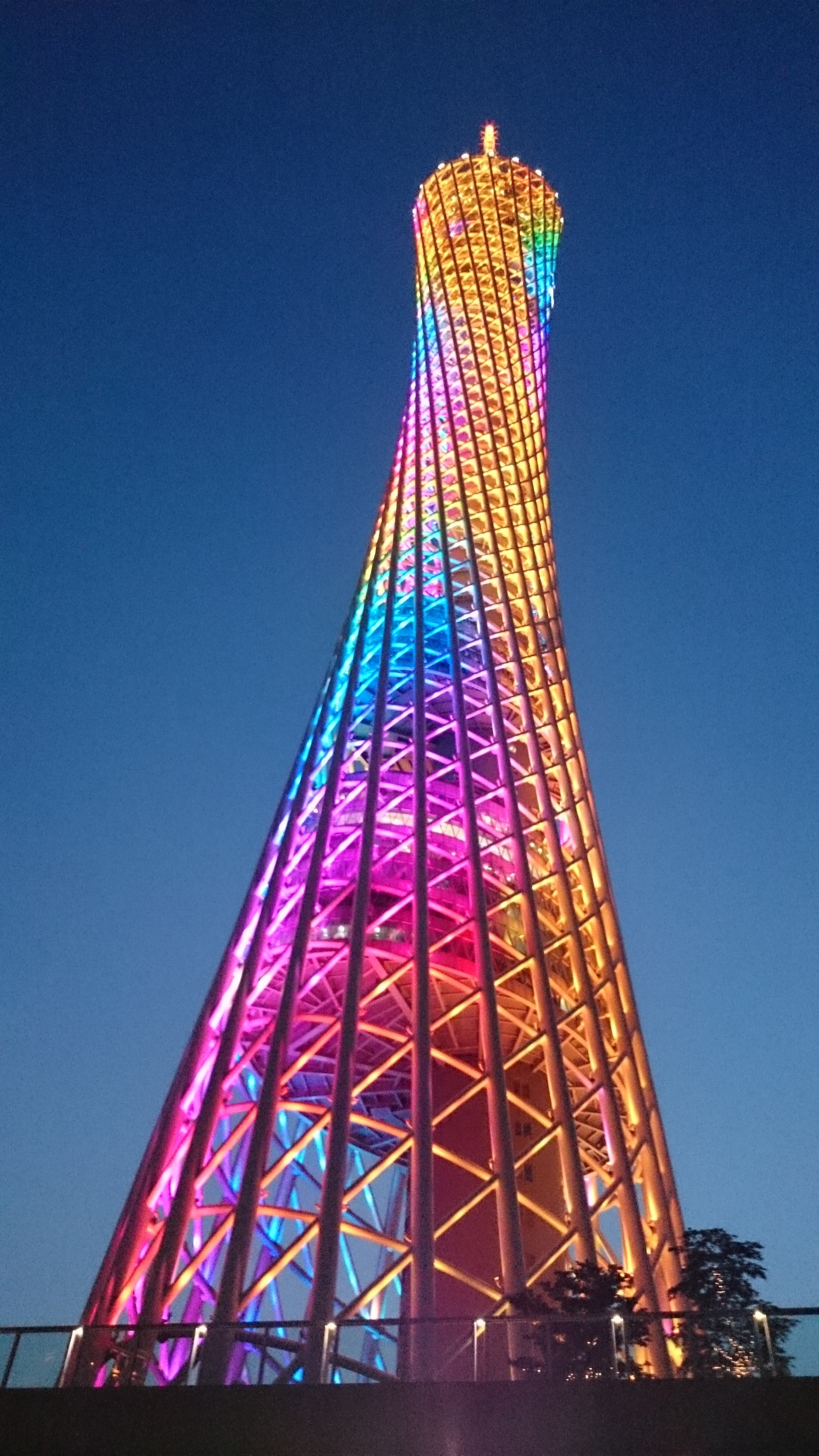 Der Turm ist der Wahnsinn. Ständig kreisen farbige Lichter um den Turm, man schafft es nicht, zwei Mal ein Foto mit identischen Farben zu machen. Das Ding lebt. Nebenbei ist das Ding in sich verdreht.