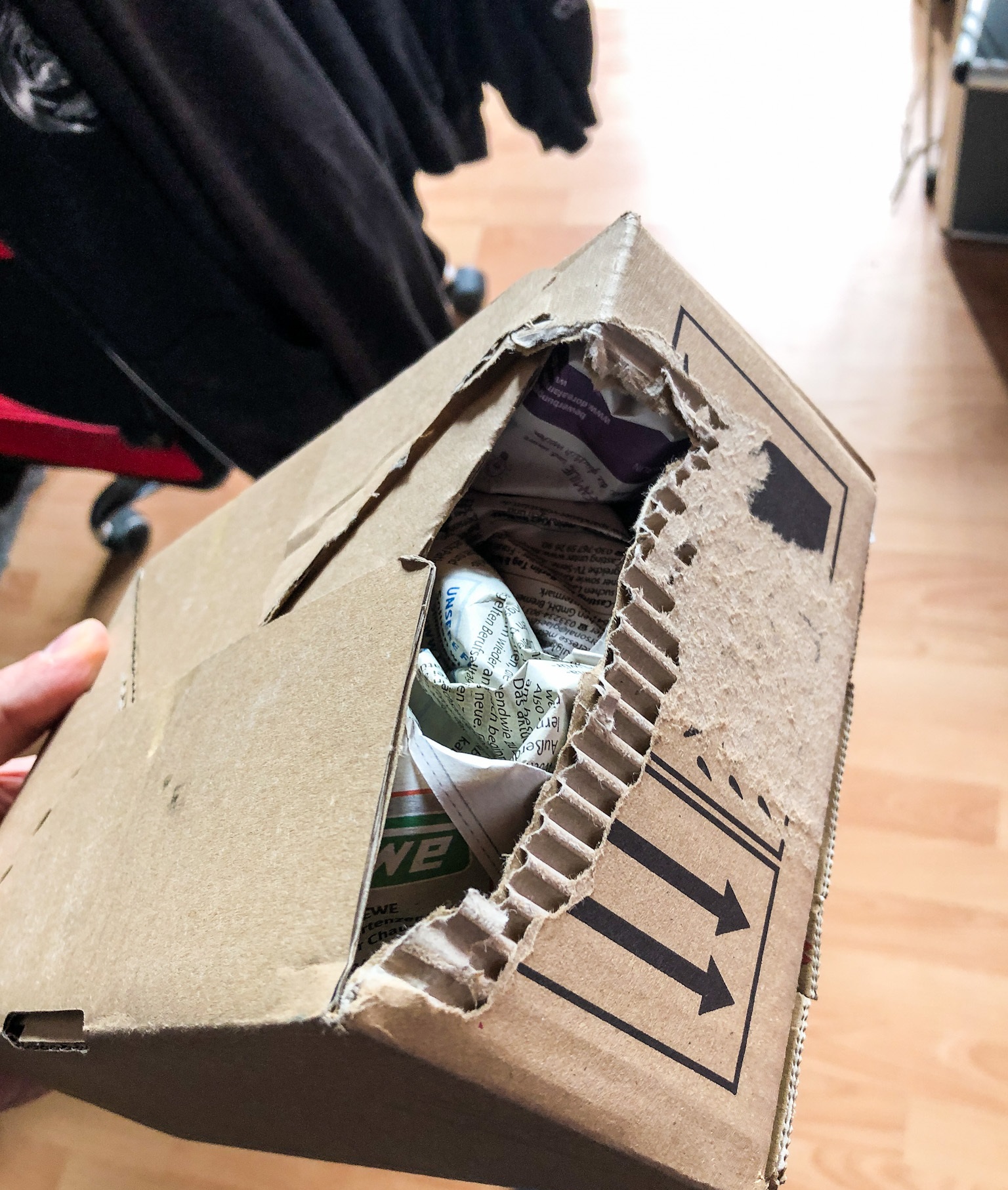 Gestern kam ich vom Einkaufen zurück und da lag tatsächlich ein Päckchen auf der Treppe. Als ich mir das Packerl schnappte und damit hoch in die Wohnung stürmen wollte, ein neuer Schock: Ein großes Stück des Kartons fehlte komplett und die Füllung aus Zeitungspapier quoll schon heraus. Also erstmal ein Beweisphoto schießen: