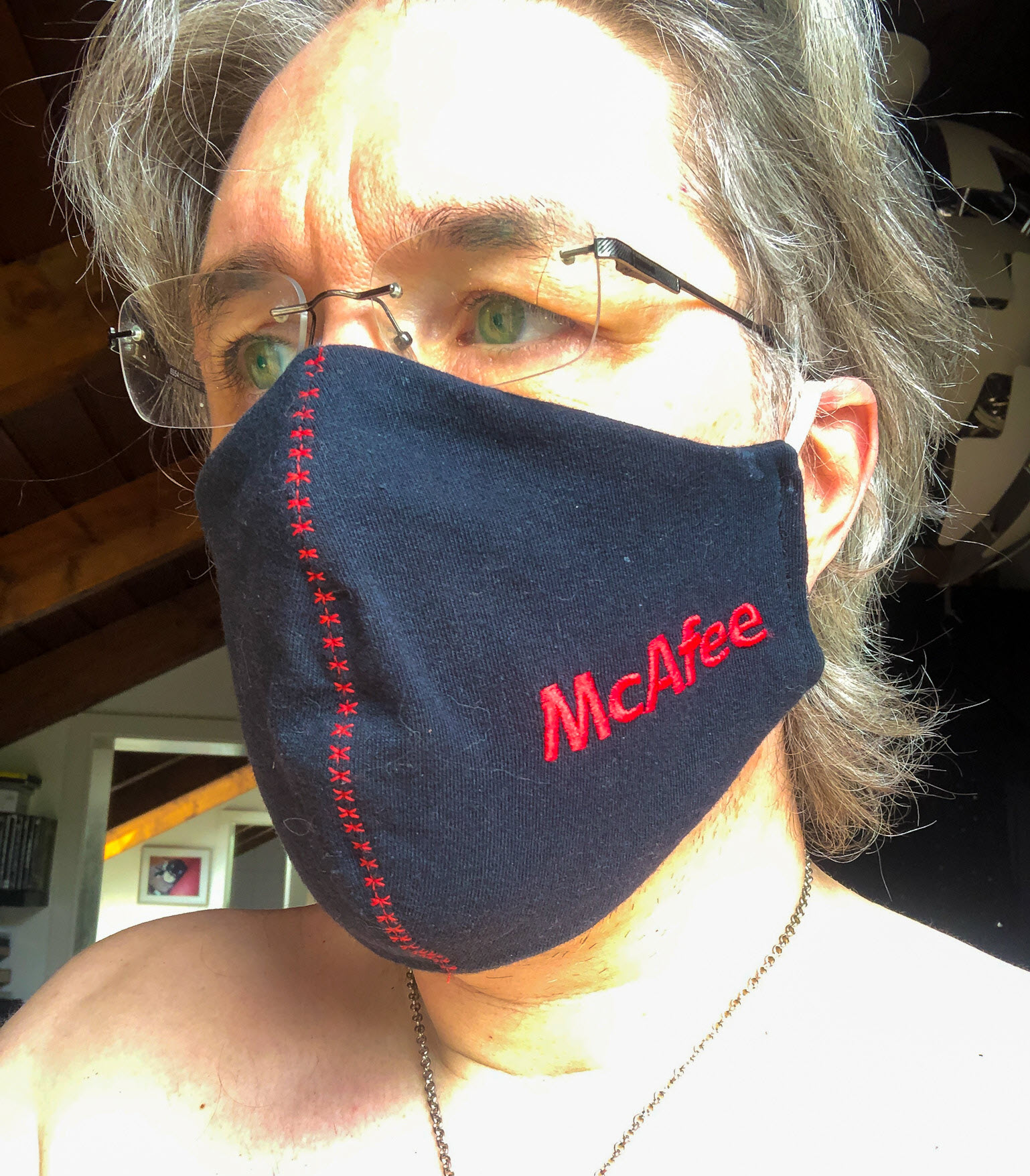 16 Aug. 2020 15:03Nicht gekauft, sondern selbstgemacht: Mund-Nase Bedeckung aus einem alten McAfee-Shirt. Davon habe ich noch ein paar herumliegen, die gabs bis vor einigen Jahren immer als Giveaway dazu, wenn man ein Training bei McAfee abgeschlossen hatte. Ich dachte mir, ein VIRENschutz mit dem Logo eines VirusScan-Herstellers wäre doch passend