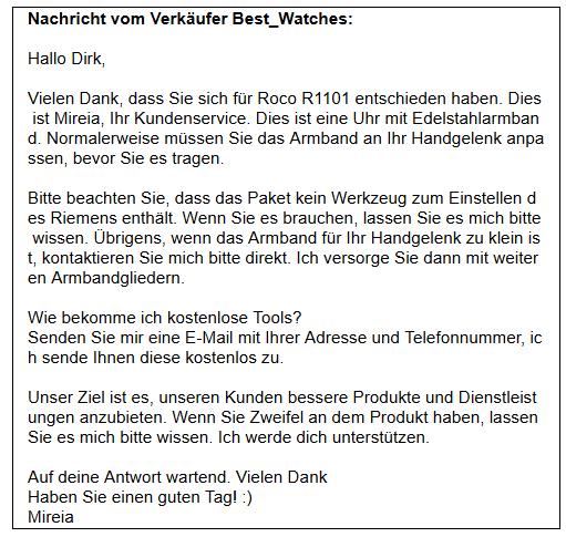 18 Jan. 2020 16:11Nichts Besonderes, so etwas habe ich natürlich auch schon. Interessant finde ich aber, wie ich es bekommen habe. Nach dem Kauf meiner Rocos bekam ich über Amazon diese Nachricht: