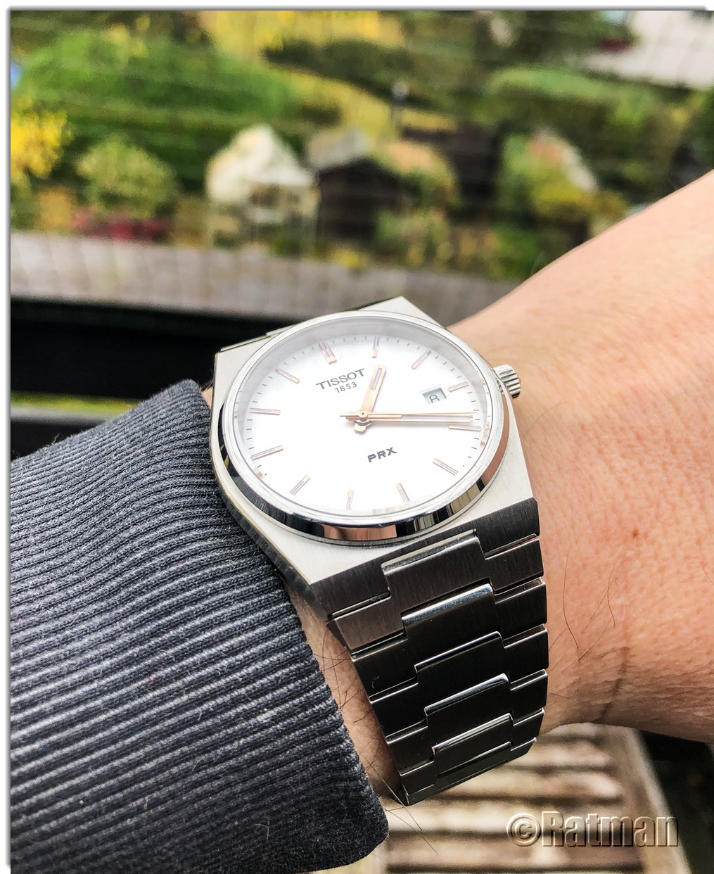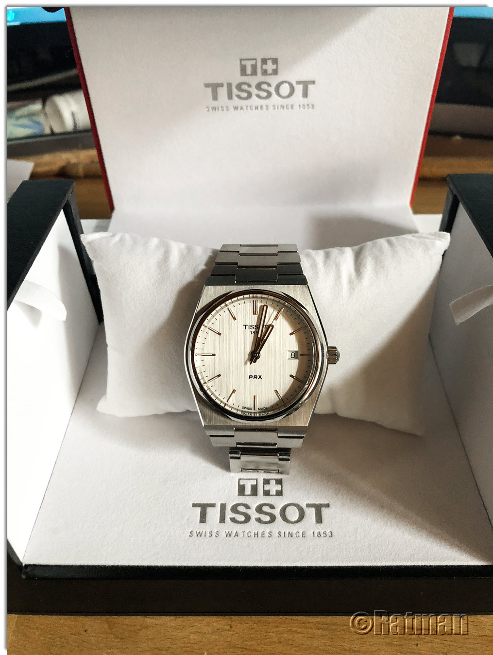 Soeben eingetroffen: Meine (fast) neue TISSOT PRX. Ich suchte schon eine ganze Weile nach einer guten Gebrauchten mit dem silbernen Längsschliff-Blatt, aber bisher war nichts Gescheites dabei. Nun bot ein freundlicher User sie im Uhrforum an und ich habe spontan zugeschlagen.