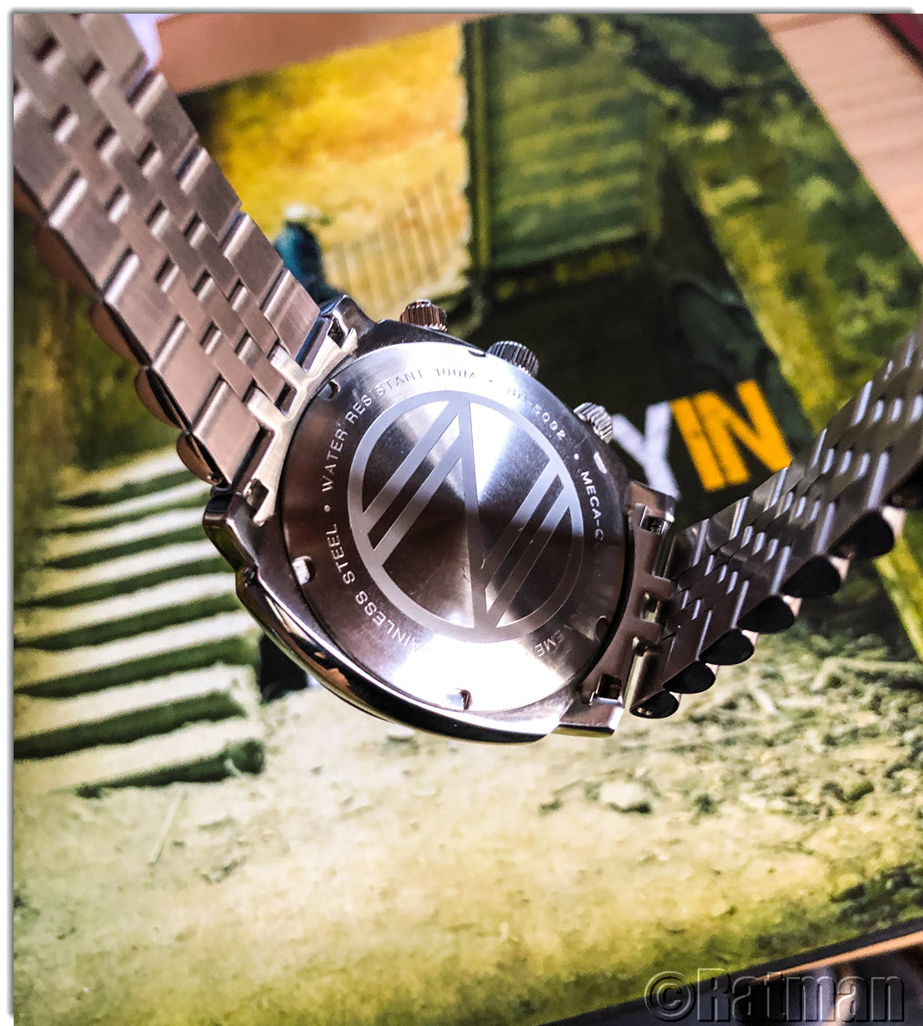 Das Jubilee-artige Band ist stramm verstiftet, sauber entgratet und mündet in passenden Endlinks. Was mir am besten an dem Teil gefällt sind die stark erhabenen Indizes auf dem rauhen California-Blatt. Daß man eine schwarze Datumsscheibe gewählt hat, macht die Sache dann endgültig rund. Definitiv ein Keeper!