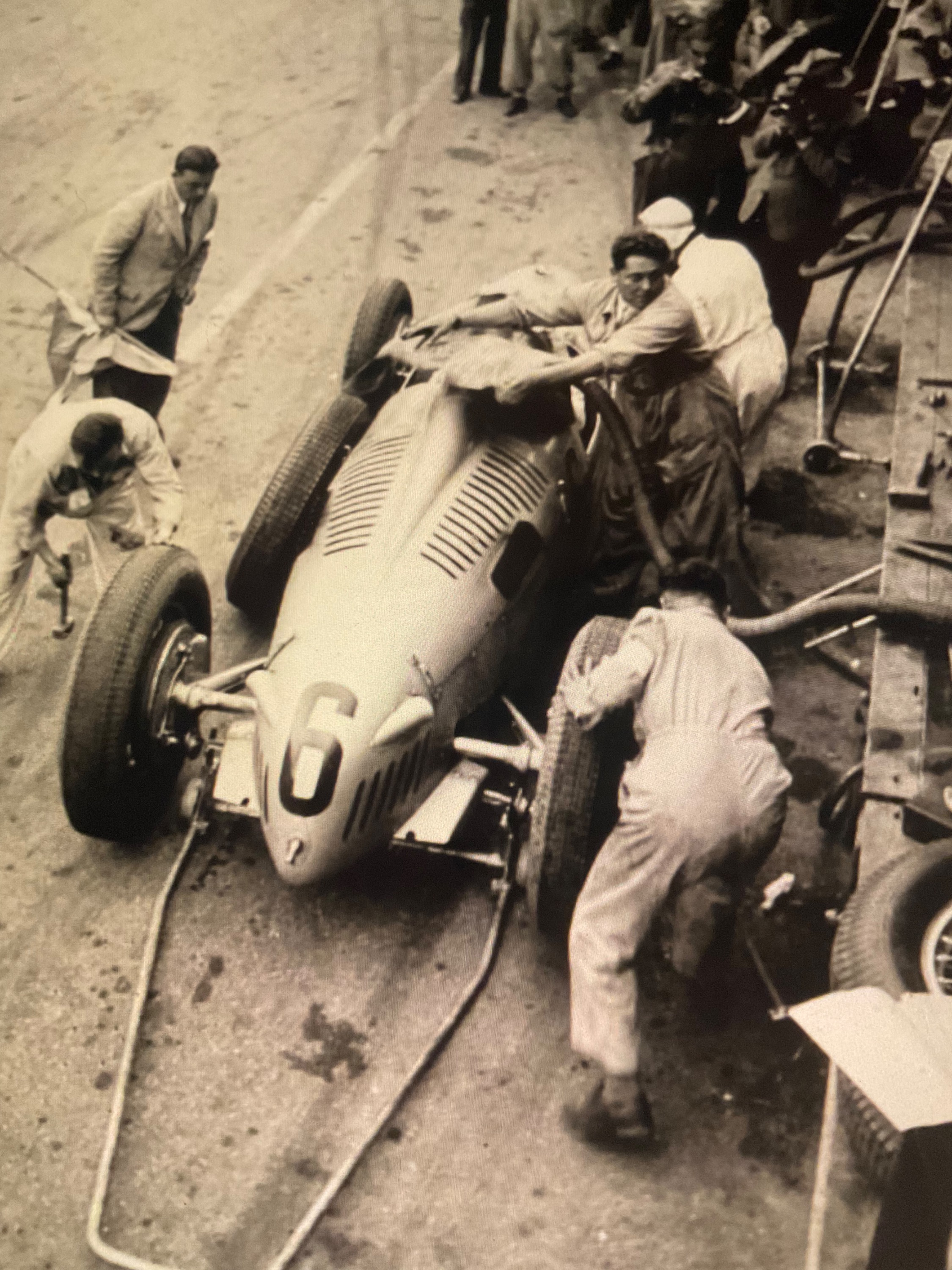 Vielleicht entstammt das Armband gar von einen Reifen, wie hier zu sehen vom Grand Prix Suisse 1936, Hans Stuck auf Auto-Union C, beim Treibstoff nachfüllen und Reifenwechsel.