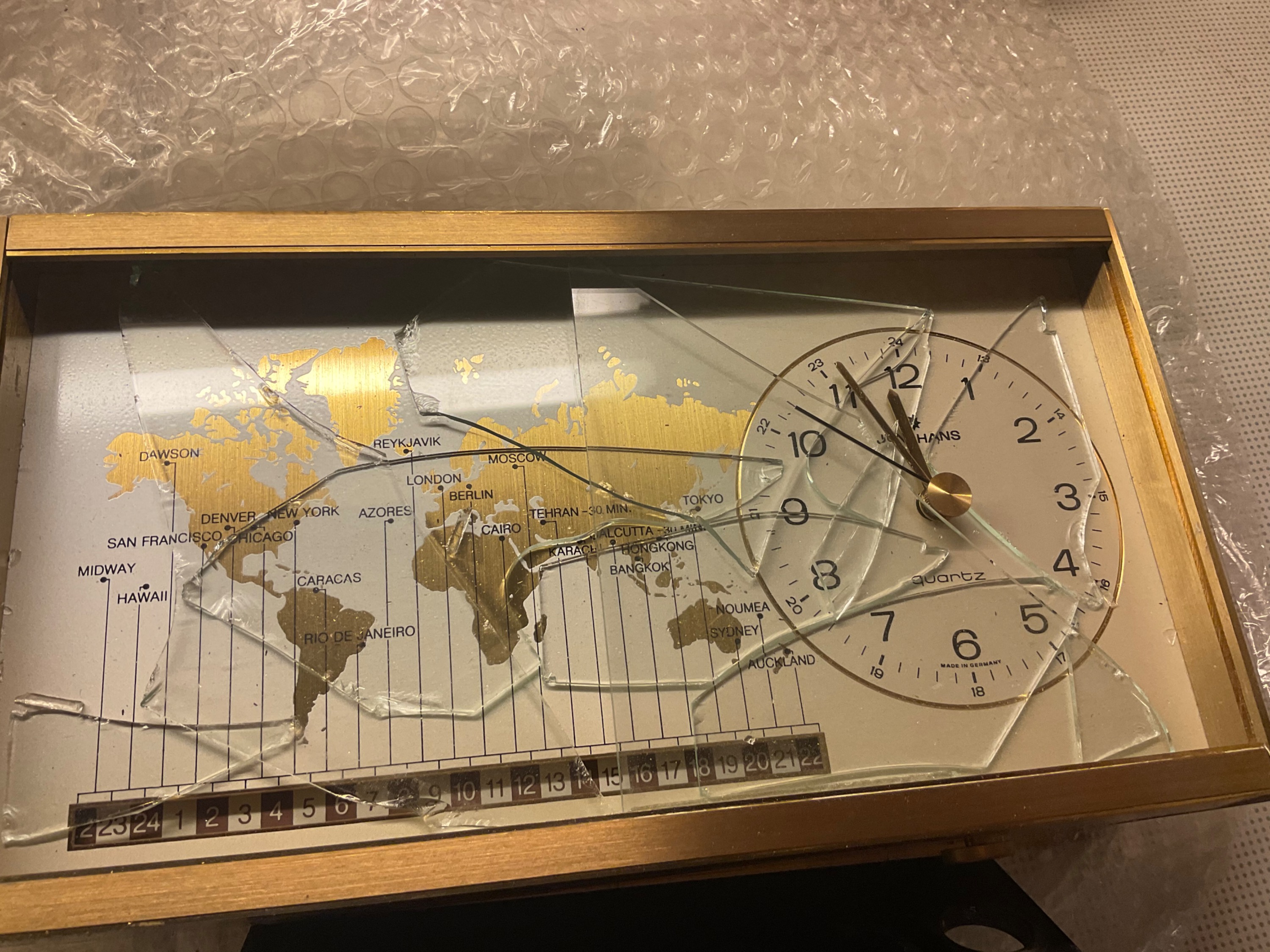Ich erstand eine Junghans Weltzeituhr, bat den Besitzer-einen jungen Mann, hatte die Uhr von der Oma vererbt bekommen-inständig die Uhr gut zu verpacken, dass beim Paketversand nichts beschädigt wurde, „ja, ja, wird schon gemacht“! Mein Fehler diesmal, ich ließ mir kein Bild vor den Versand zuschicken. Denn ich befürchtete das Frontglas würde kaputtgehen.