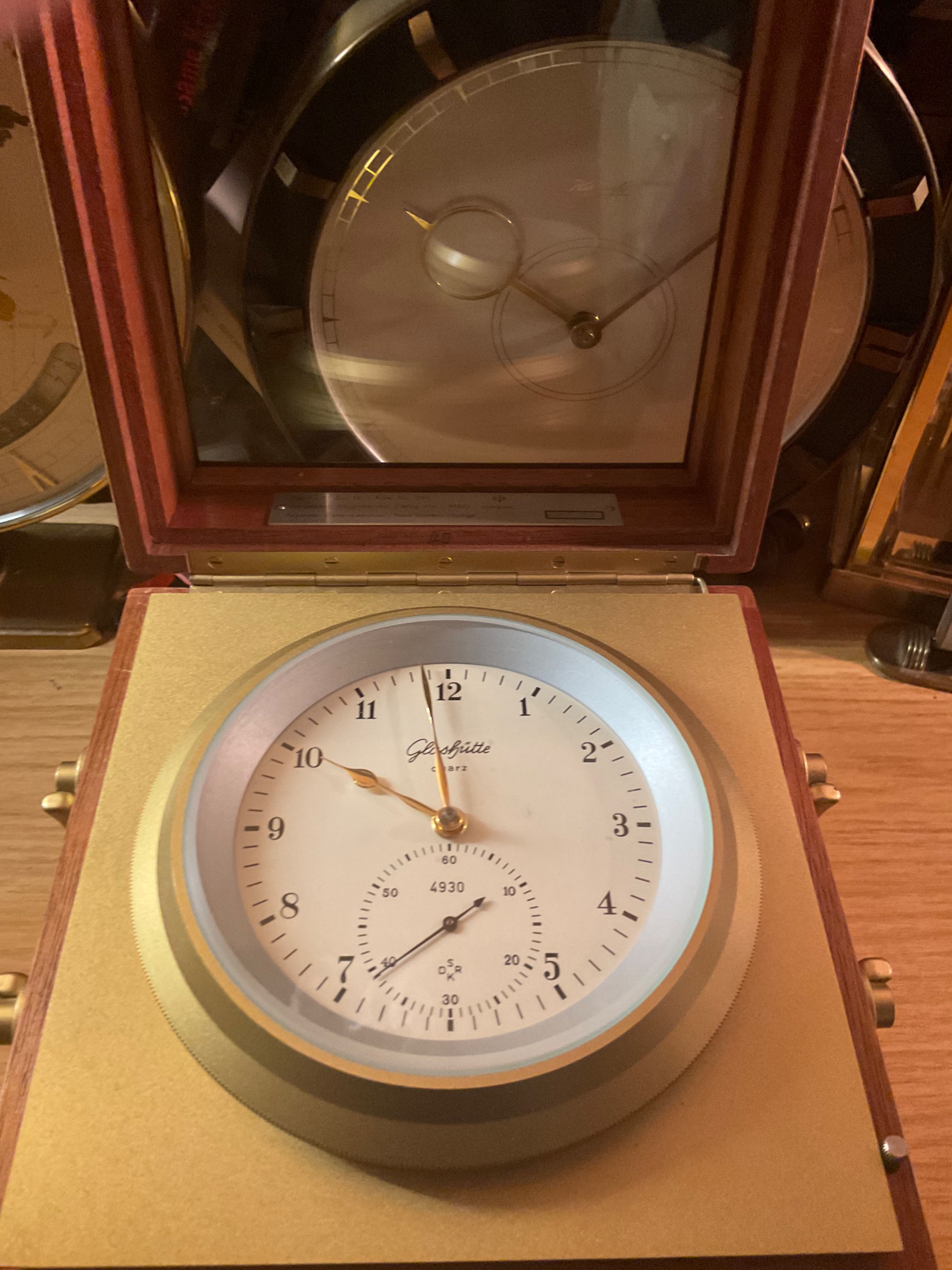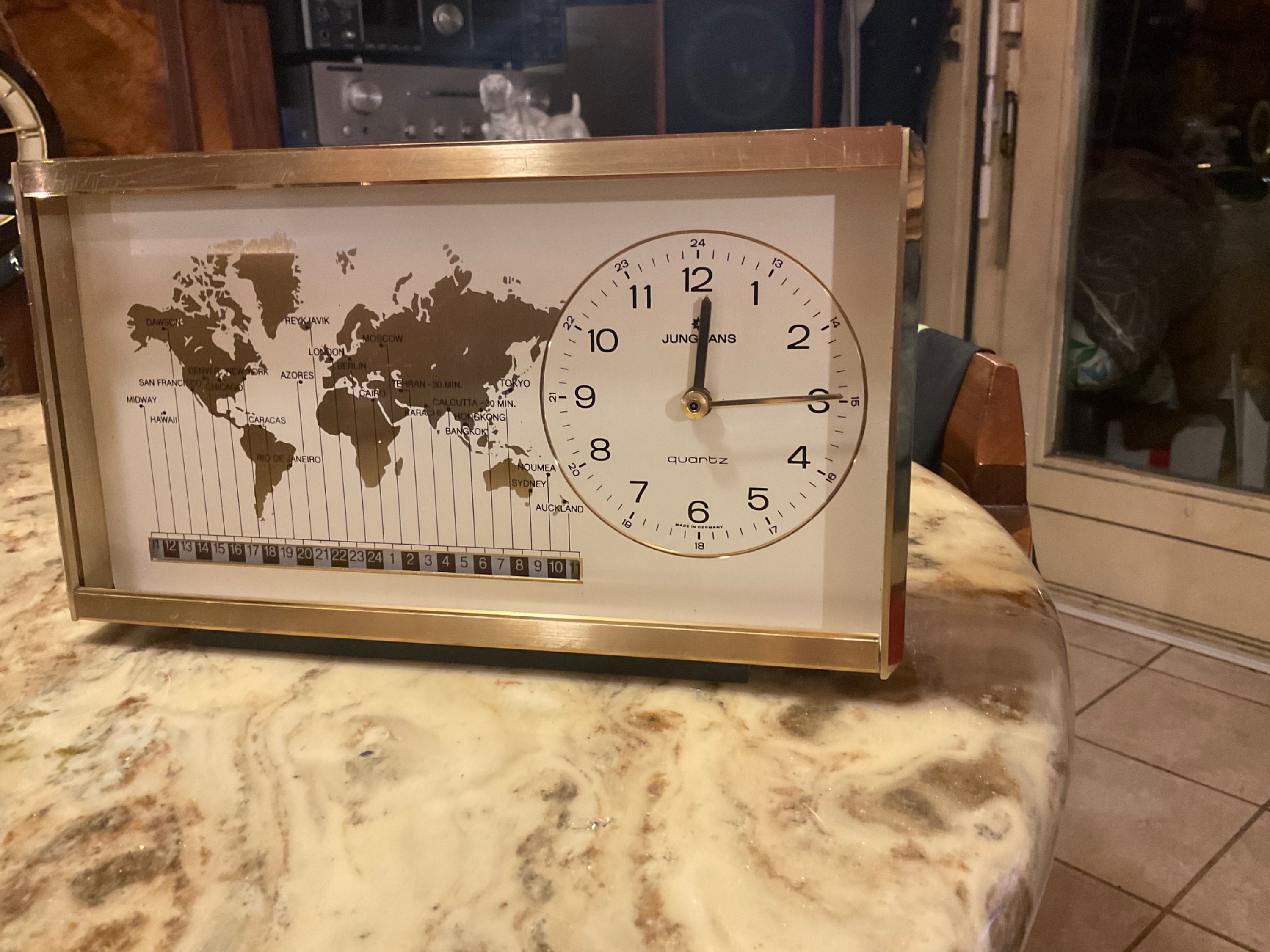 Es ist die Junghans Weltzeituhr, von ca. 1970, ca. 3 kg schwer (!) massives Messinggehäuse, und was bei dieser Uhr, abgesehen davon, dass sie sehr selten und mit desolaten Zustand angeboten wird, ist, dass das Förderband, die Rolle mit den 24 Stunden-Zeiten , meistens defekt ist.