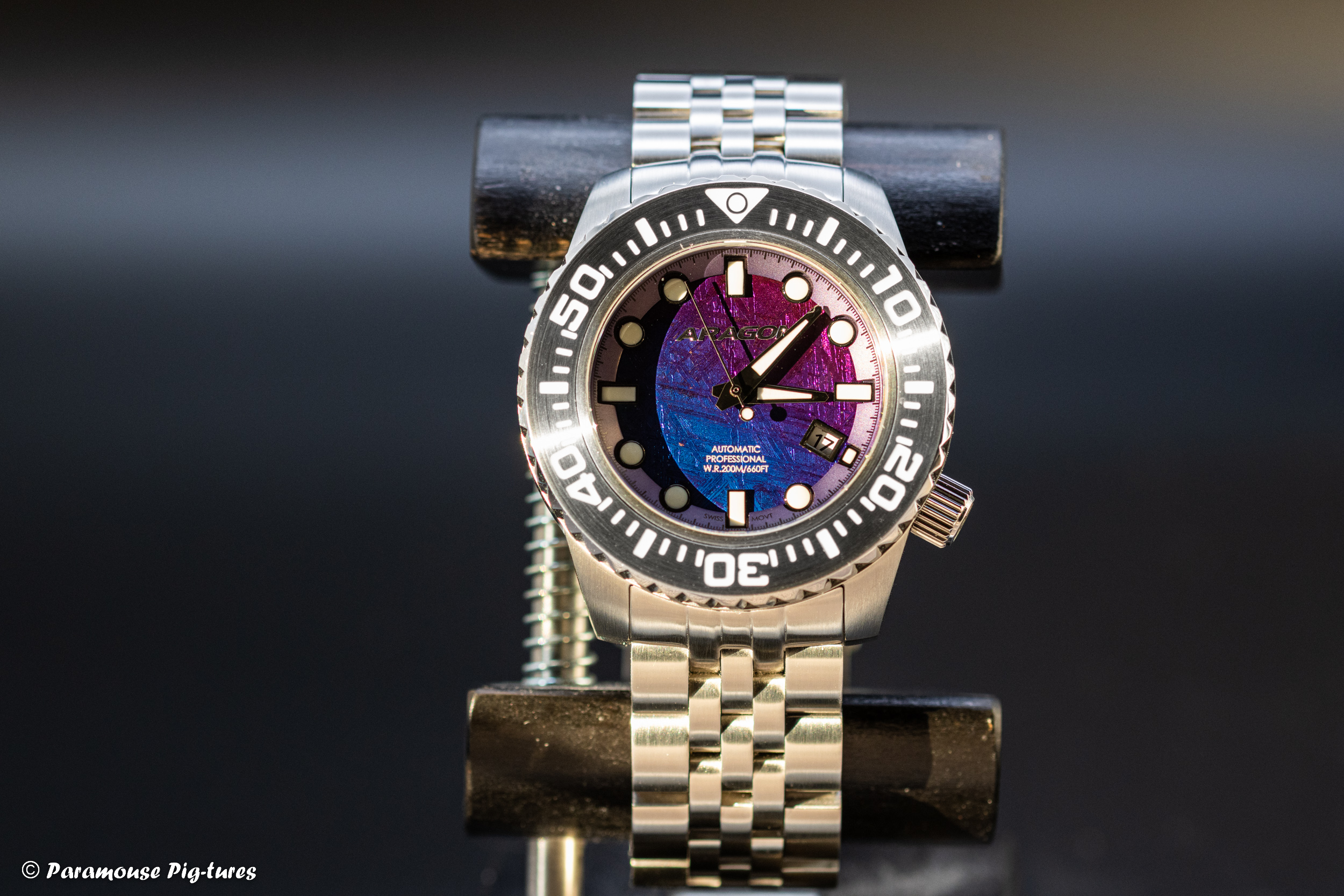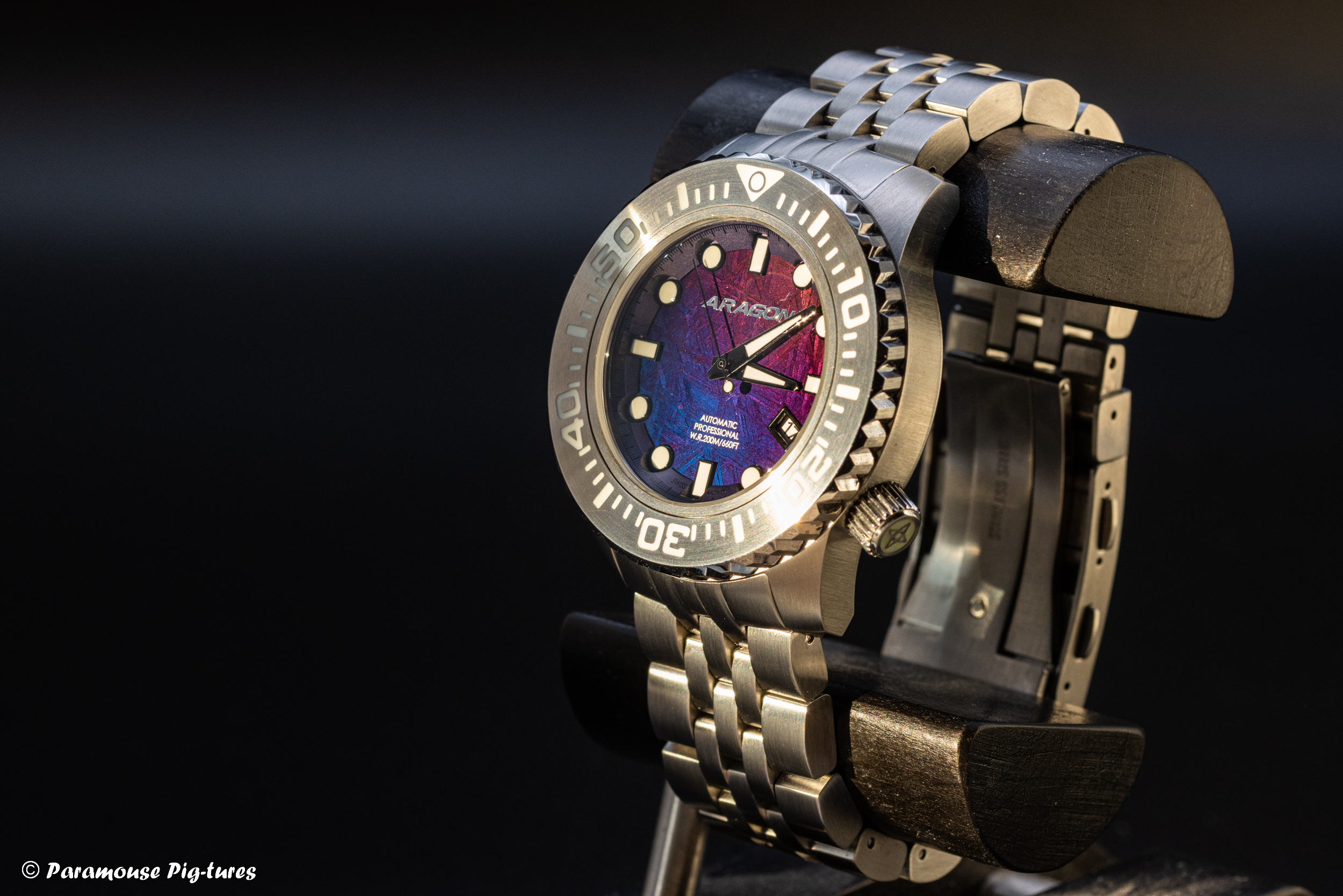 Gestern ist sie wie gesagt bei mir eingetroffen und ich bin hin und weg von dem Ührchen. Ich habe ja bereits drei EVOs in meiner Sammlung und kenne das Modell dadurch schon recht gut. Aber die Limited Edition ist einfach grandios. Das Zifferblatt schimmert je nach Lichteinfall in einem tiefen Blau bis zu dunkleren und helleren Violett-Tönen. Die typische Meteorit-Struktur sieht man übrigens in den meisten Fällen nur sehr dezent. Bei den helleren Farbvarianten kommt der Meteorit-Effekt besser zum Vorschein. Aber ich wollte bewusst dieses dunkle Violett.