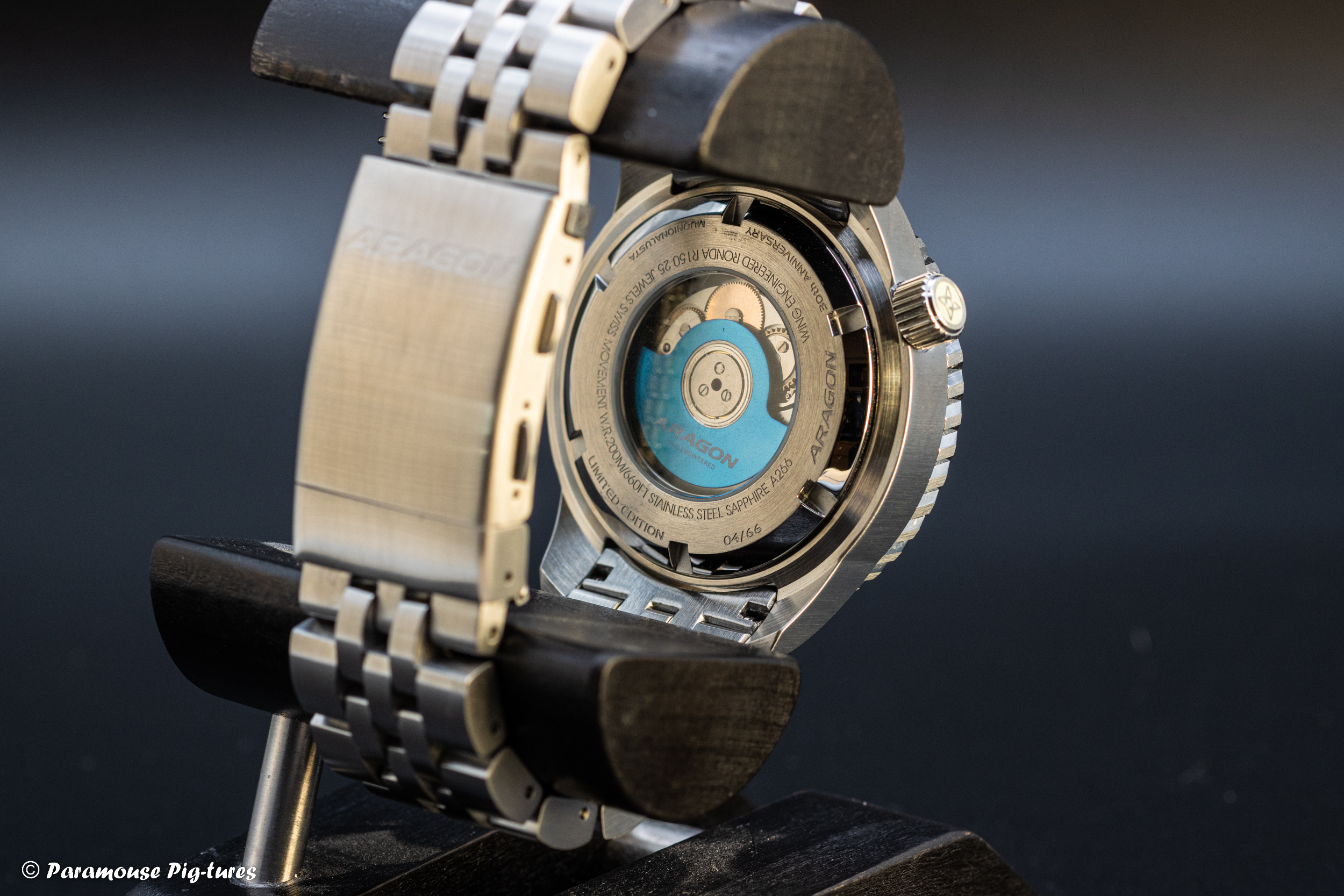 Schön anzusehen: rückwärtiger Deckel mit Sichtfenster auf das hübsche Ronda R150 mit blauem Rotor plus ein Hinweis darauf, welches Exemplar der limitierten Serie man vor sich hat (hier die vierte von 66)