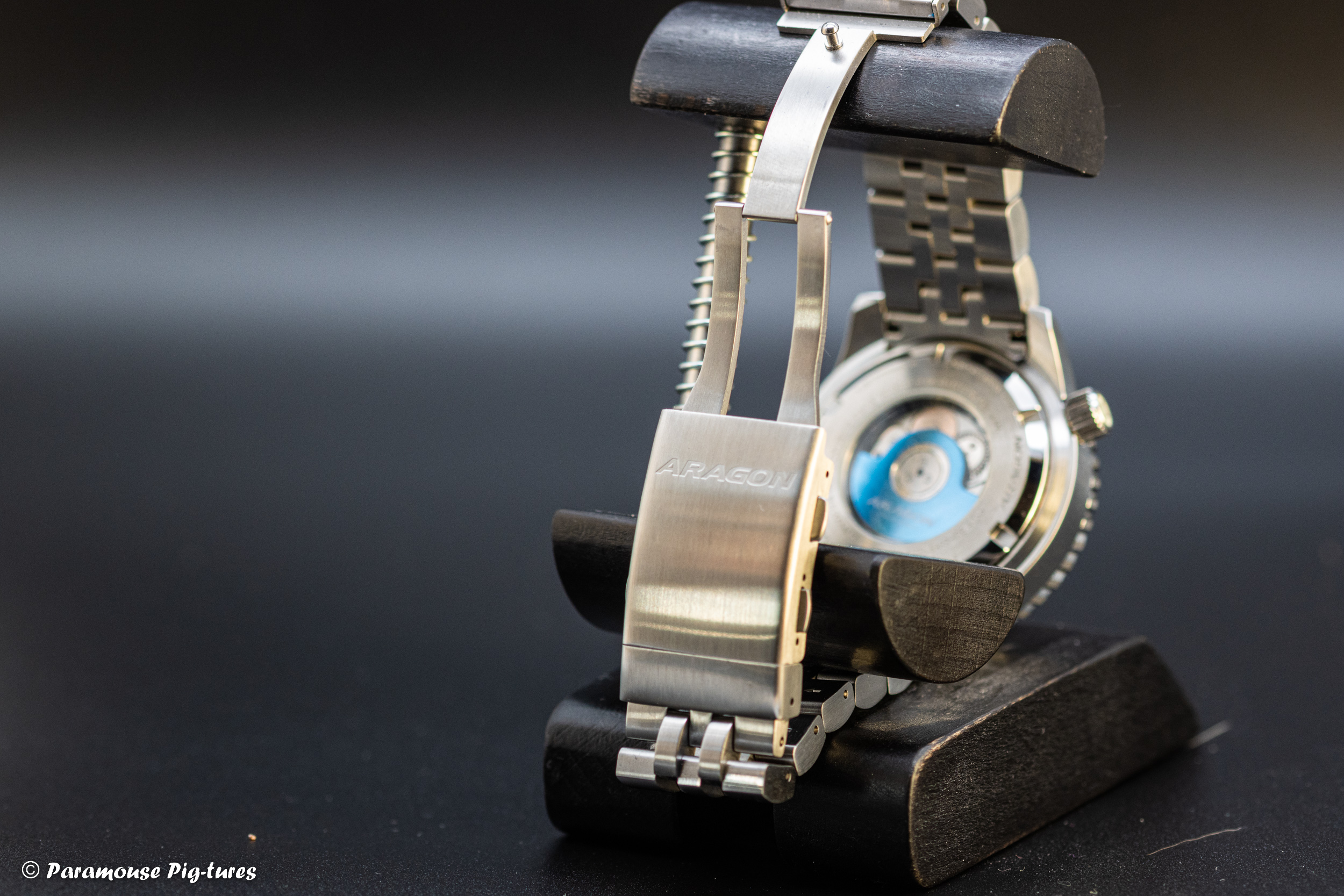 Der Rest der Uhr ist wie beim normalen Modell: extrem massives Armband mit ebensolcher Schließe, ein Bollwerk von einem Gehäuse mit Krone bei vier Uhr und die markante Lünette mit dem "Zahnrad"-Rand.