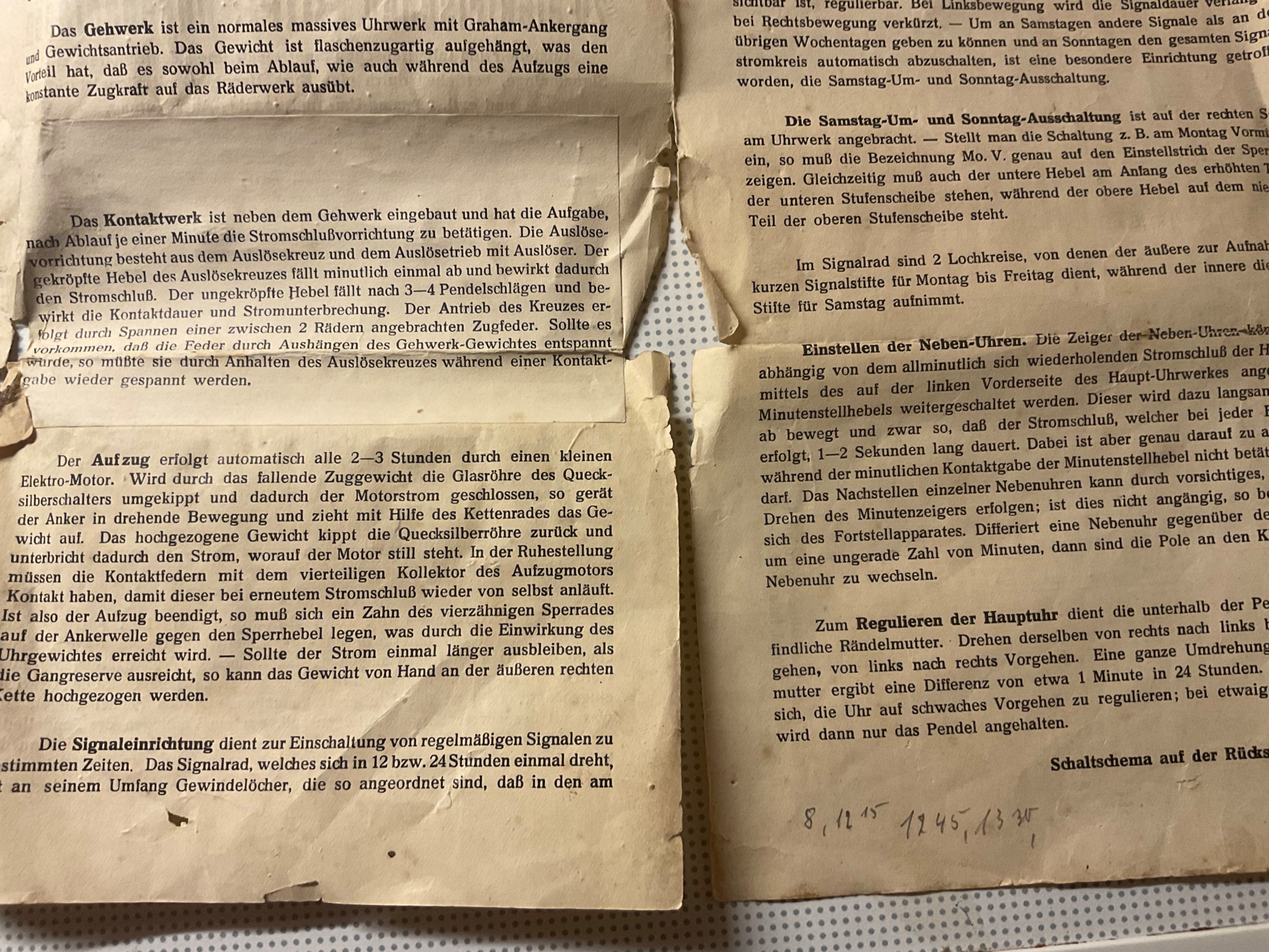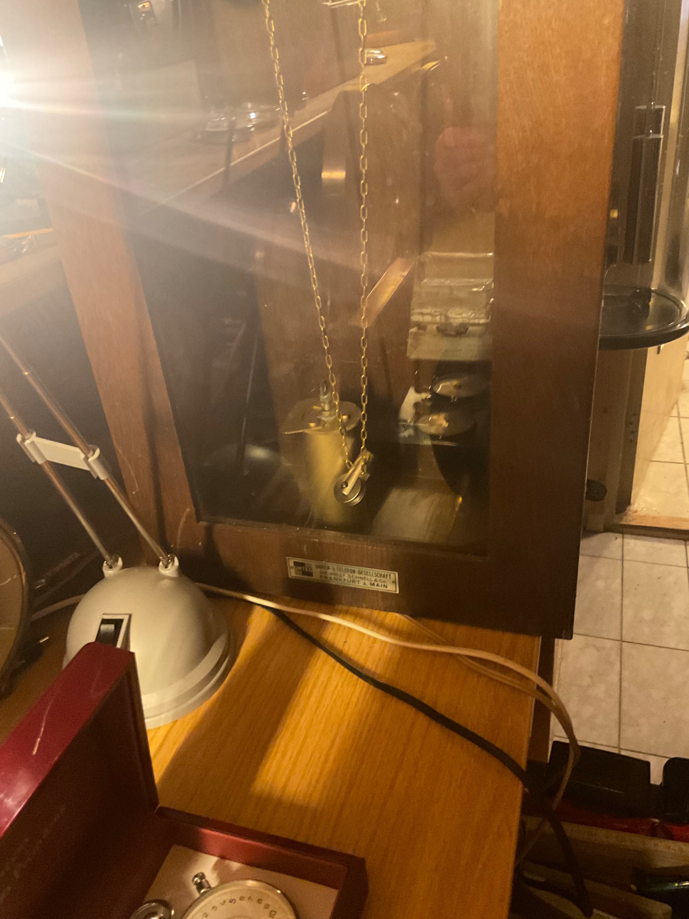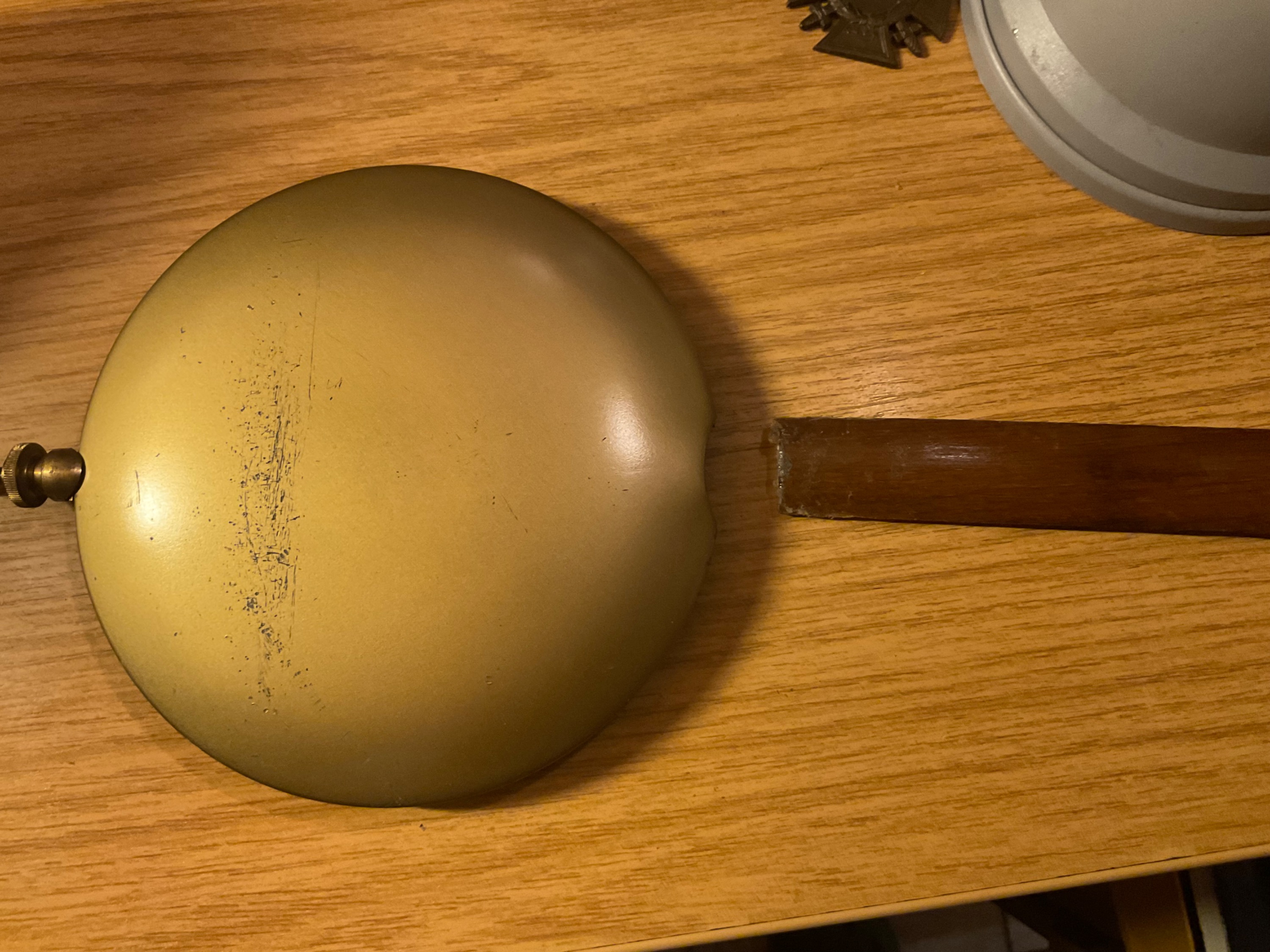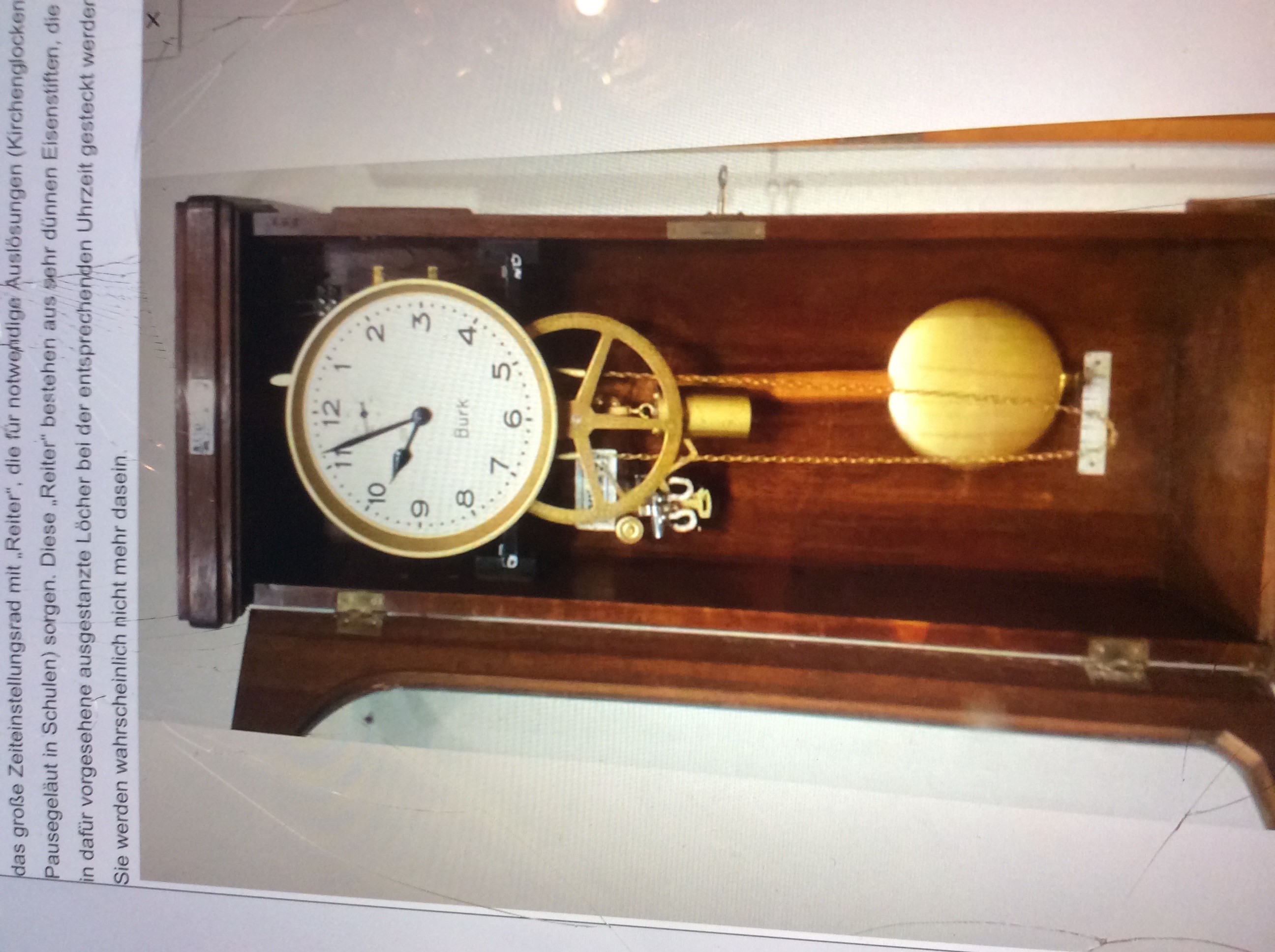 Das Problem ist der abgebrochene Holzpendel-Stab. Mein Mentor in diesen Sachen, leider noch älter als ich, will wieder eine „Sonderkonstruktion“ machen, dazu braucht er ein paar Sachen vom Baumarkt, und der Weg dahin ist „voller Hindernisse“! Außerdem muß noch eine „statische Berechnung“ durchgeführt werden, hält die Messingschraube den Scherkräften der Uhr (ca. 20 kg) stand, oder muß gar eine Stahlschraube rein!?