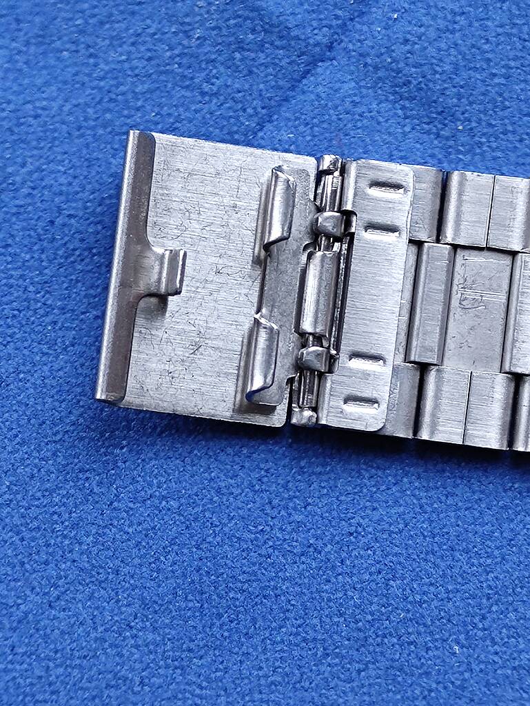 Ich habe hier mal ein Bild von einem NOS-Band (wohl 70er Jahre), das einen Teleskop-Anschluss hat, d.h. die Seitenstücke sind federnd und können zusammengedrückt werden. Dadurch kann dieses variable Band an Uhren mit verschiedener Anstossbreite (lug width) verwendet werden, zwischen 17 mm Minimum und 22 mm Maximum. Wenn man sich die dünnen zusammendrückbaren Teleskopstücke seitlich am Bandanschluss wegdenkt, hat man hier ein Band mit 17 mm Anstossbreite, bei dem das erste Glied an den Schultern 22 mm breit ist. Das Band verläuft auf 16 mm an der Schliesse.