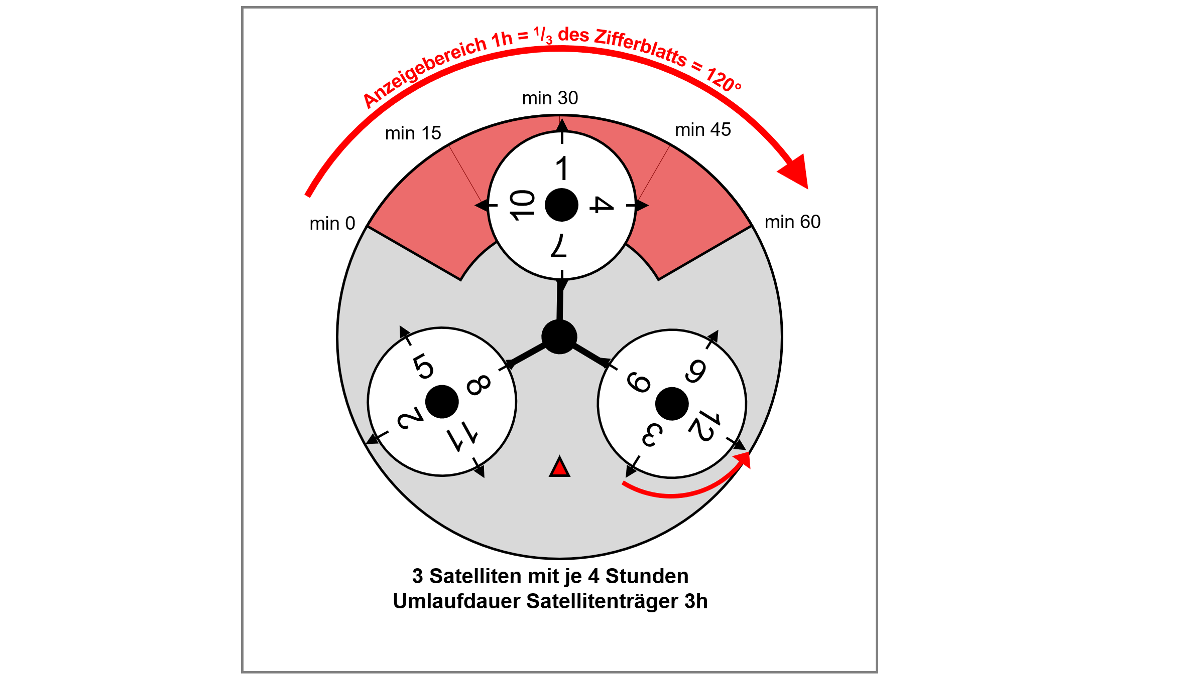 Das kleine Dreieck über der 10 auf dem sich drehenden Satelitten zeigt ca. auf die 30 der Skala, damit ist die Anzeige der Minuten realisiert. (Wobei, wenn man pingelig ist, müsste bei der Stellung des Sekundenzeiger das Dreieck näher an der 30 der Minutenskala sein - scnr