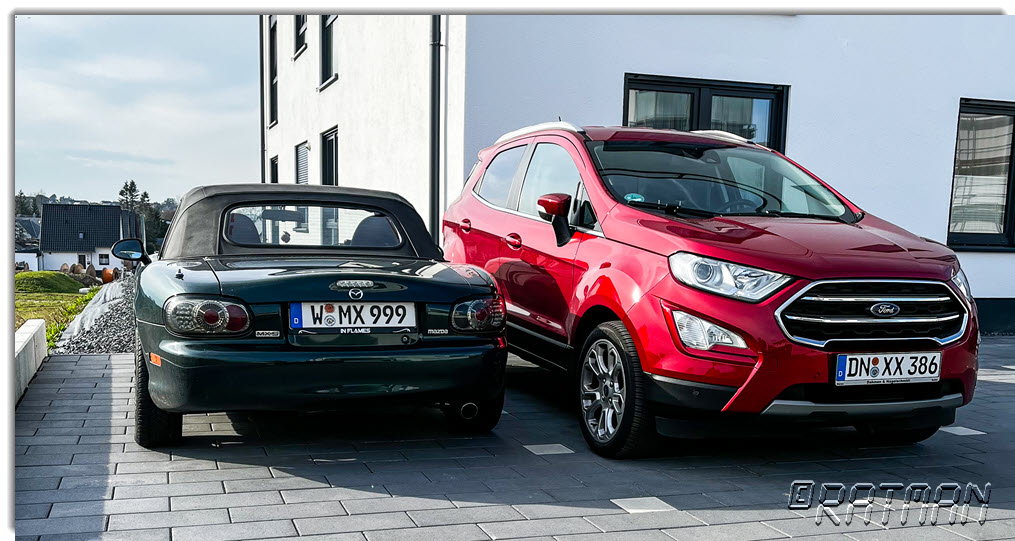 EDIT: Hab mir jetzt nochmal die Daten vom EcoSport angeschaut. De facto dürfte der Ecosport nur 6 Zentimeter länger sein als der MX-5. Die Länge ist beim Ford mit 4017–4325 mm angegeben, wobei die 4325 mm wohl nur dann erreicht werden, wenn man das Reserverad auf der Hecktür mitbestellt hat. Da mein EcoSport das jedoch nicht hat, würde ich mal von 4017 mm ausgehen. Der MX-5 ist mit 3955 mm angegeben. Bei Gelegenheit werde ich mal nachmessen.