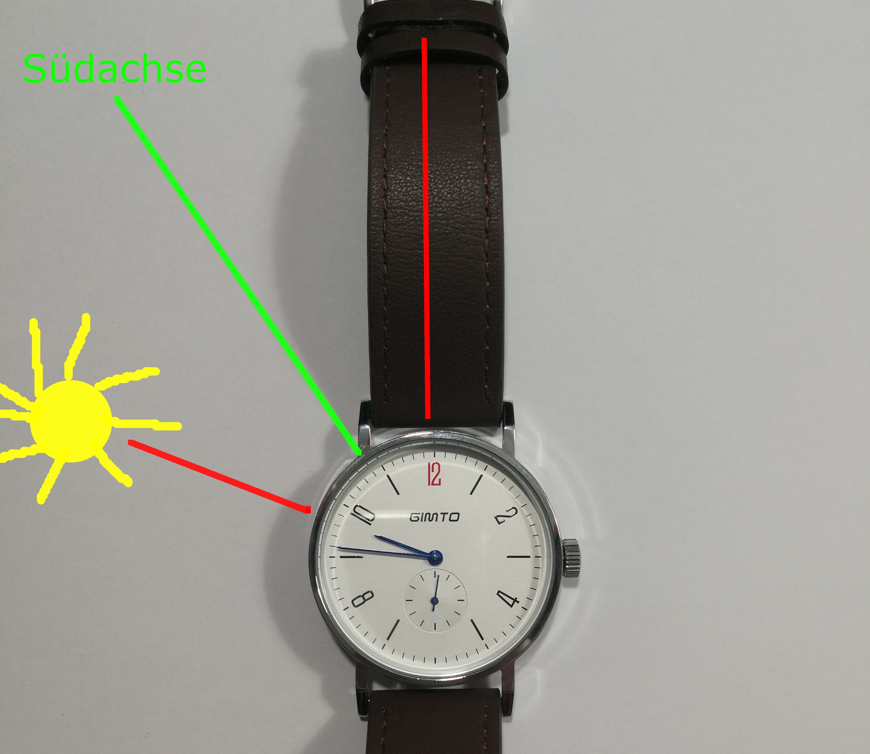 Halt, was ist, wenn es draußen diesig ist, da sieht man keine Sonne! Richtig. Dann wirst du elendig zugrunde gehen oder baust dir eine Hilfe mit z.B. einem Stock und suchst Schattenwurf. Hast du ein Messer in der Tasche, wird es noch genauer, da schmal.