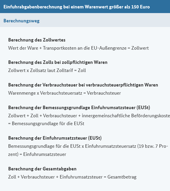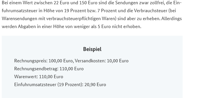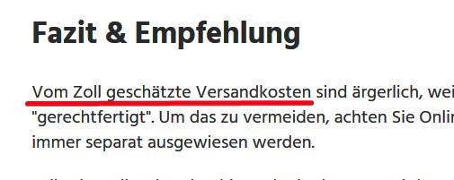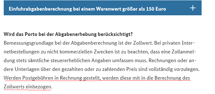 01 Apr. 2020 16:04Das Beispiel auf der Seite hinkt aber, denn in aller Regel werden pauschaul €85 für Porto vom Zoll veranschlagt. Wie der Zoll ausgerechnet auf so einen Betrag kommt, bleibt mir ein Rätsel! Ich wette, 99,9% aller (Klein)güter, die von DHL, FedEx, etc. befördert werden, dürften sehr viel weniger an Porto kosten