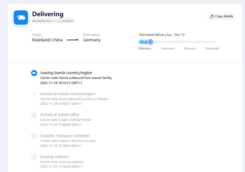Sendungsnummer mit NL, dann geht es noch über die Niederlande. Wenn es dann >150€ war, dann noch die Verzollung in D, dann klingt der 12.12 realistisch.