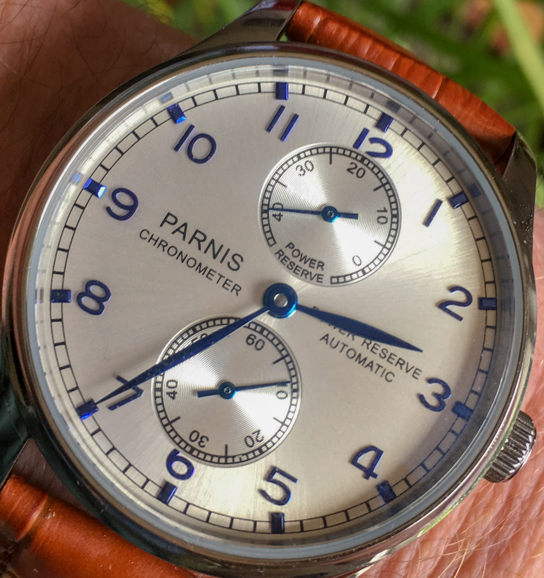 43mm PARNIS Power reserve faltschließe ST2542 Automatische bewegung silber zifferblatt blau