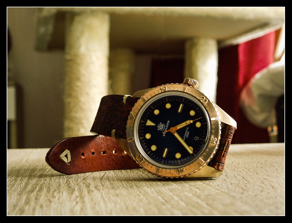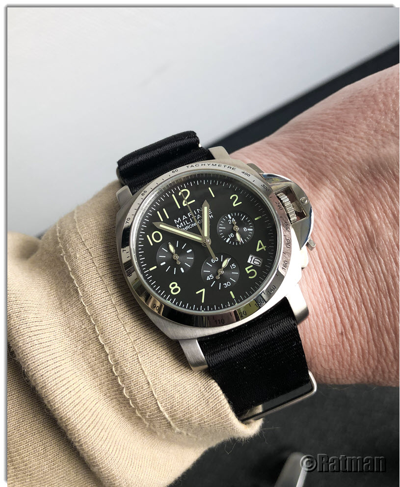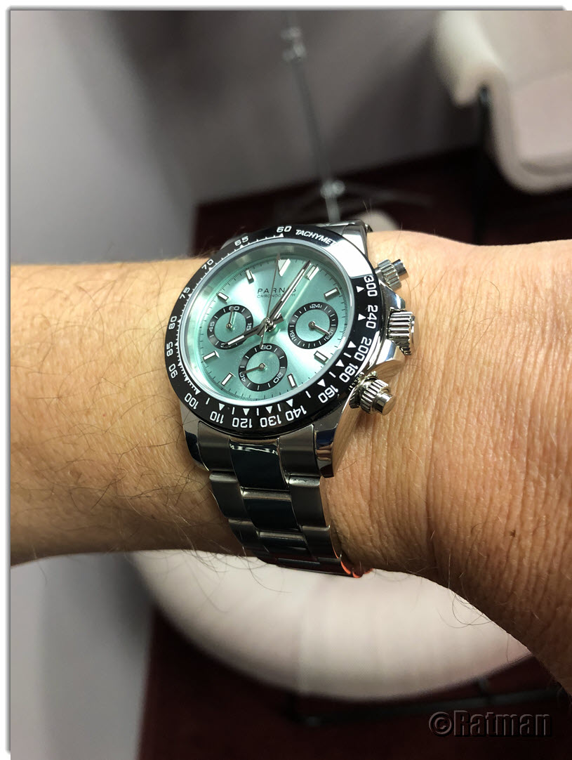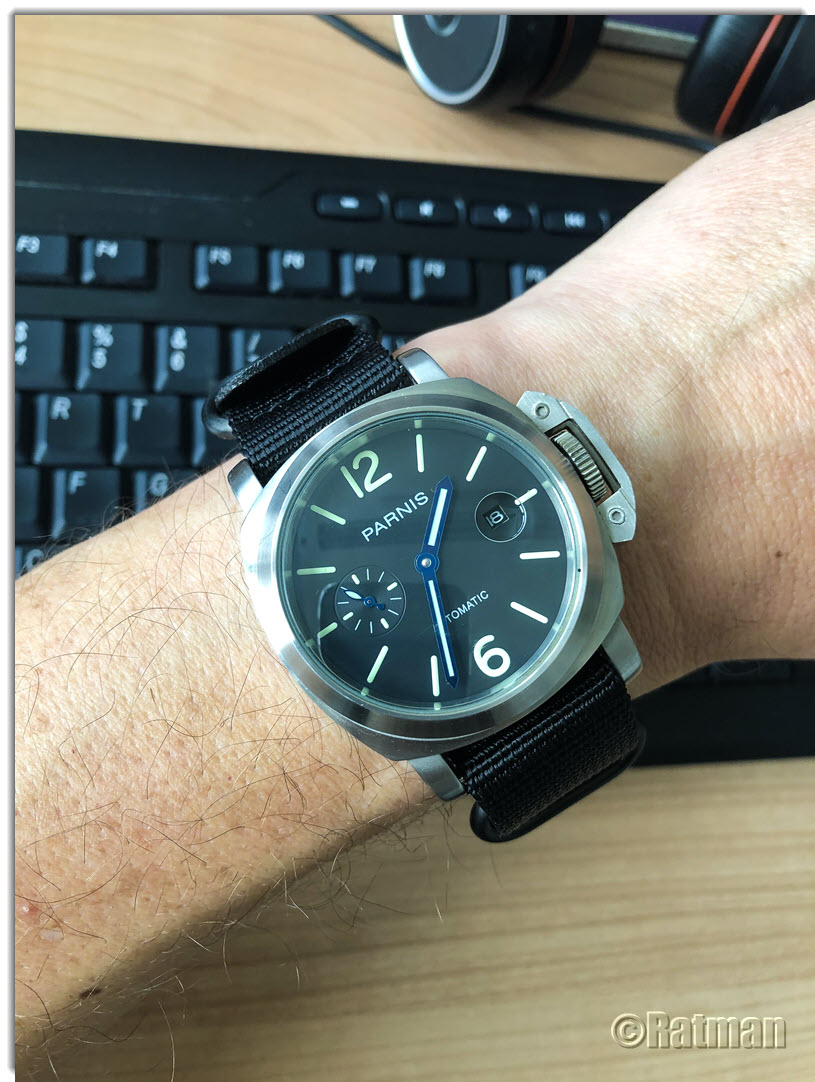 Heute natürlich die Neue: PARNIS MM Chrono am schwarzen Seatbelt-Nato. Und nun auch ohne Folie auf dem Glas