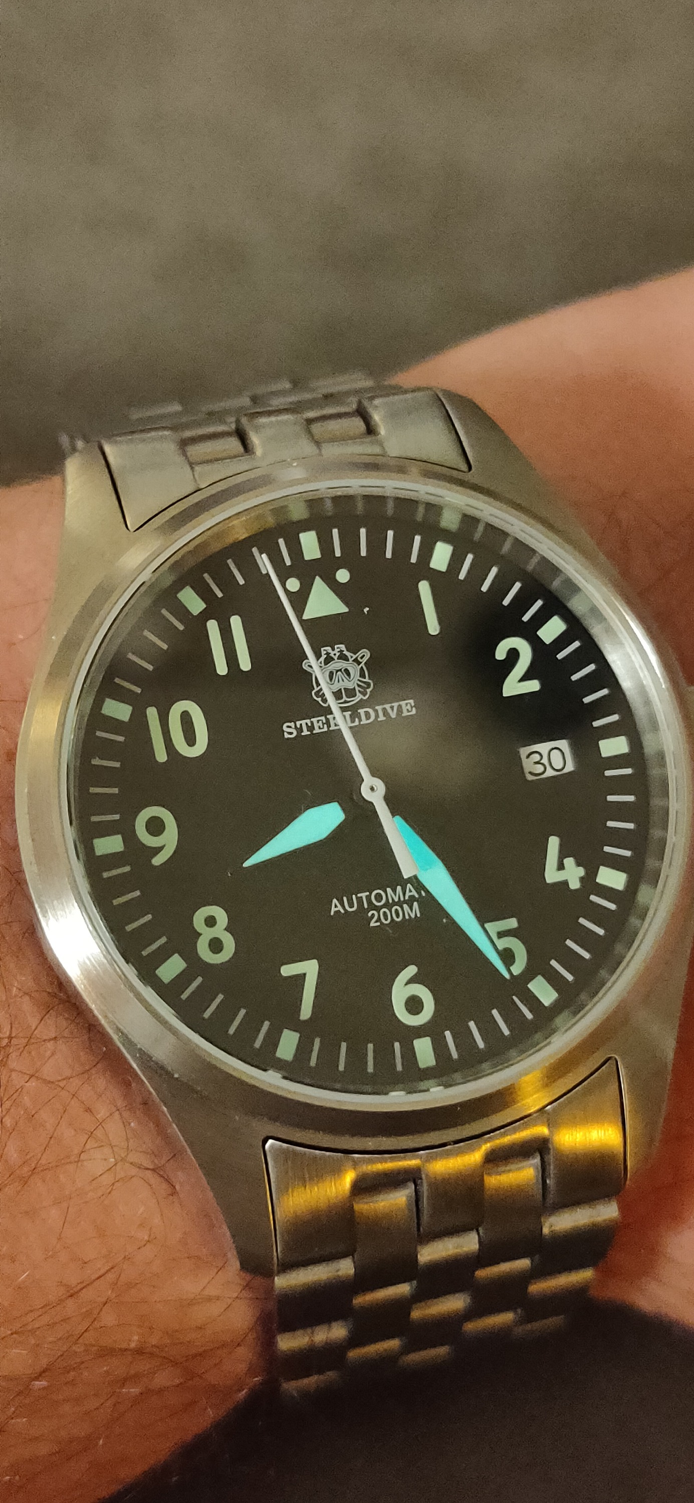 Steeldive Flieger mit NH35 und Stahlband. Das Band ist so lala, die Schließe war Mist und wurde getauscht...