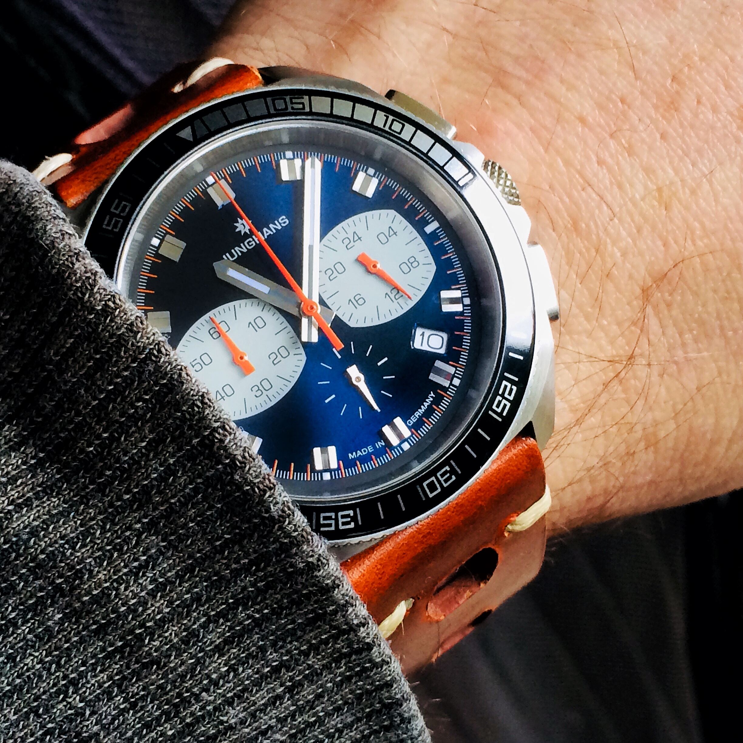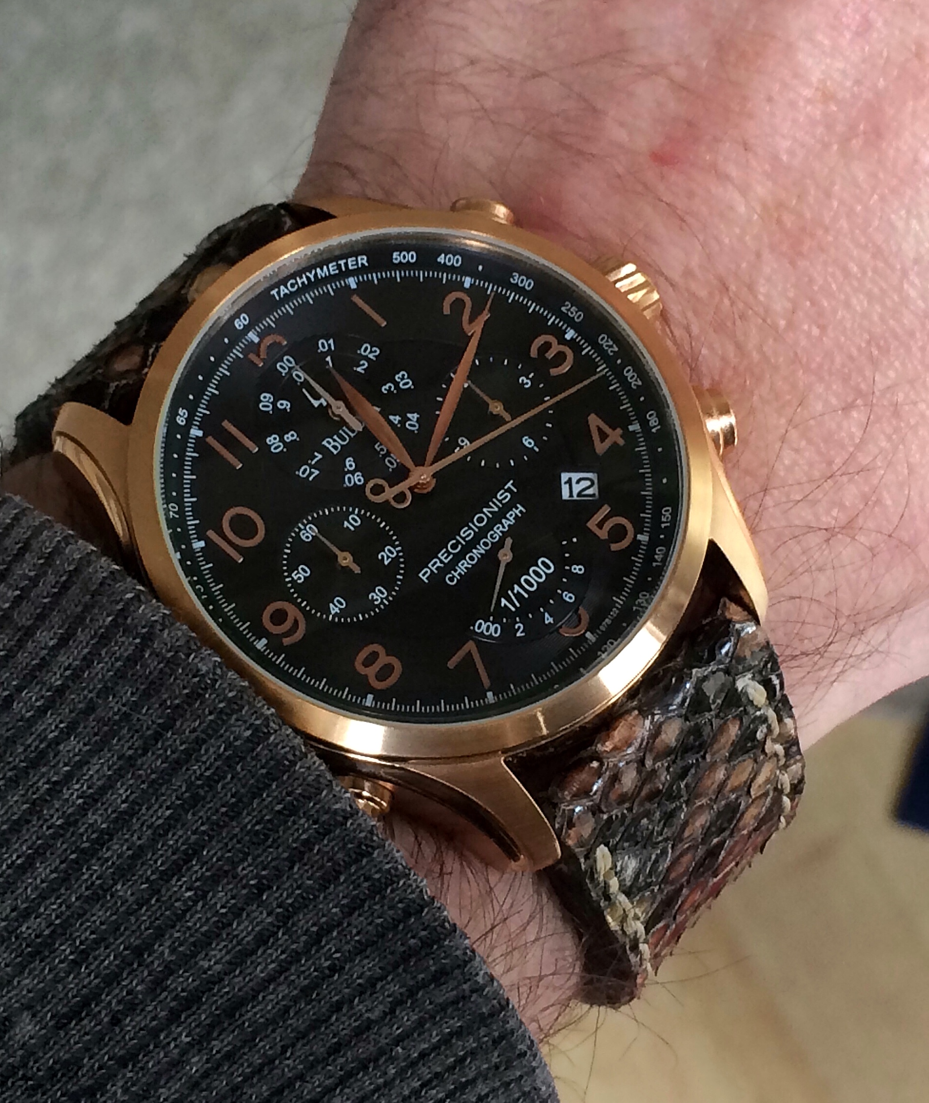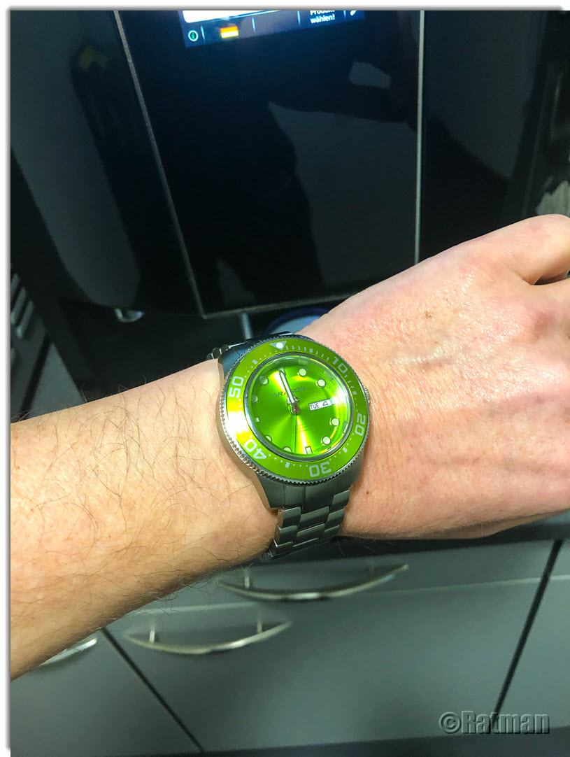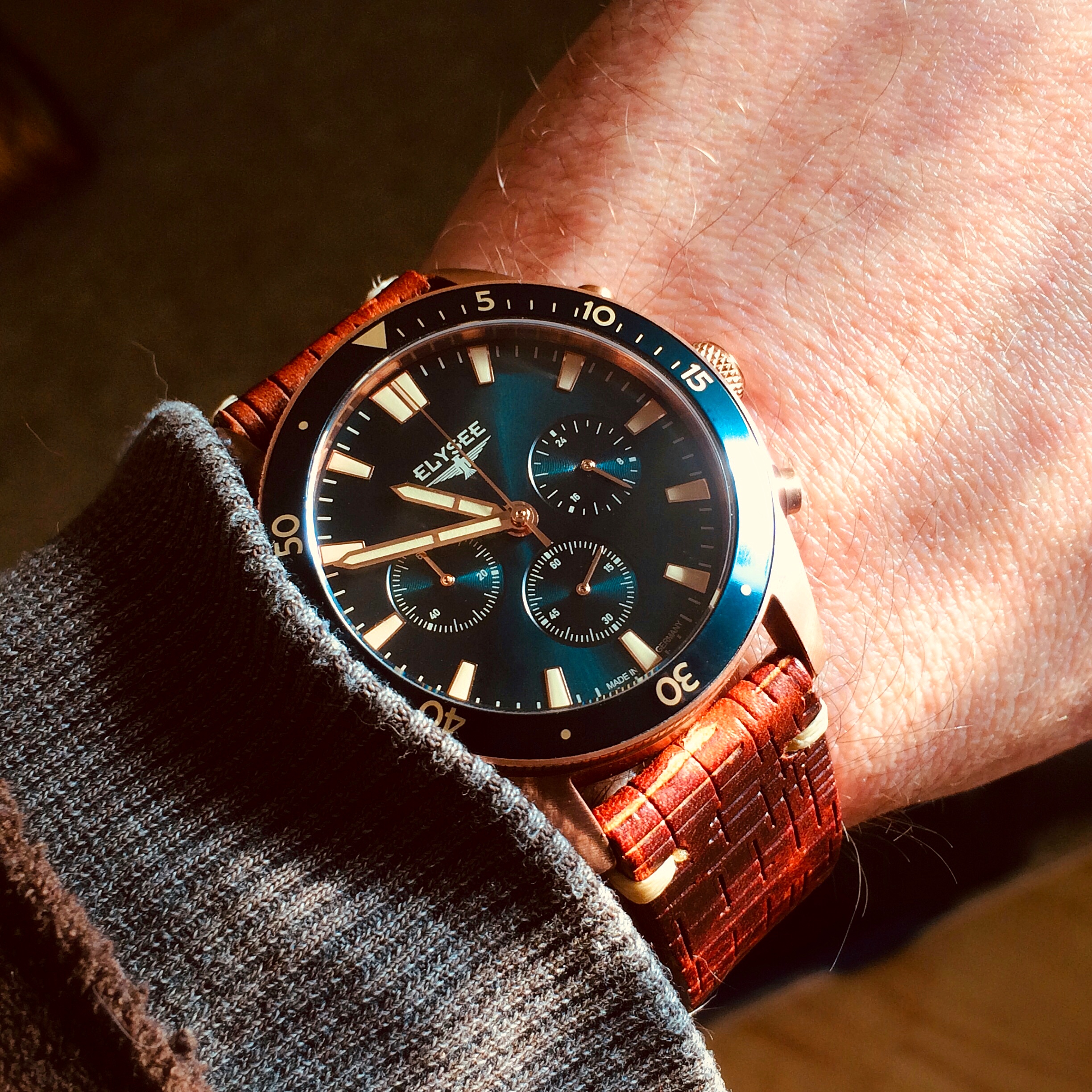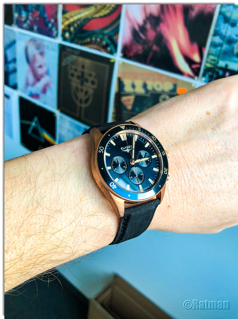 Bin begeistert. Sie trägt sich sehr schön, der Sekundenzeiger steht micrometergenau auf der 12 und die Farbe ist einfach ein Traum. Meine zweite Elysee in der Sammlung und meine erste Bronze-Uhr. Die Firma hat ihren Sitz hier in Düsseldorf knapp 7 km von meinem Arbeitsplatz entfernt auf der anderen Rheinseite. Wenn man sonst nur Uhren trägt, die tausende Kilometer entfernt zusammengedengelt wurden, ist das schon ein lustiges Gefühl, wenn die Uhr, die man gerade trägt, quasi von "um die Ecke" kommt