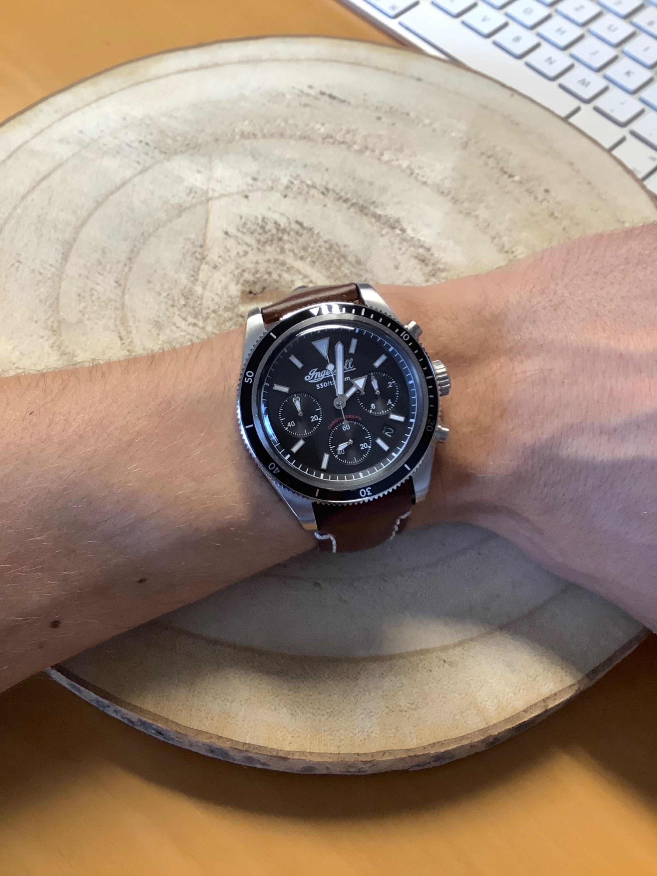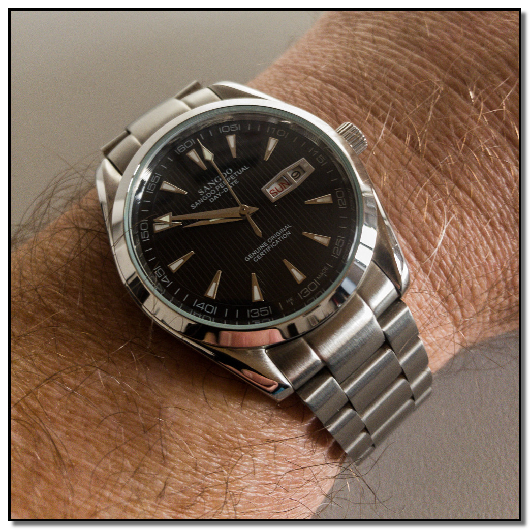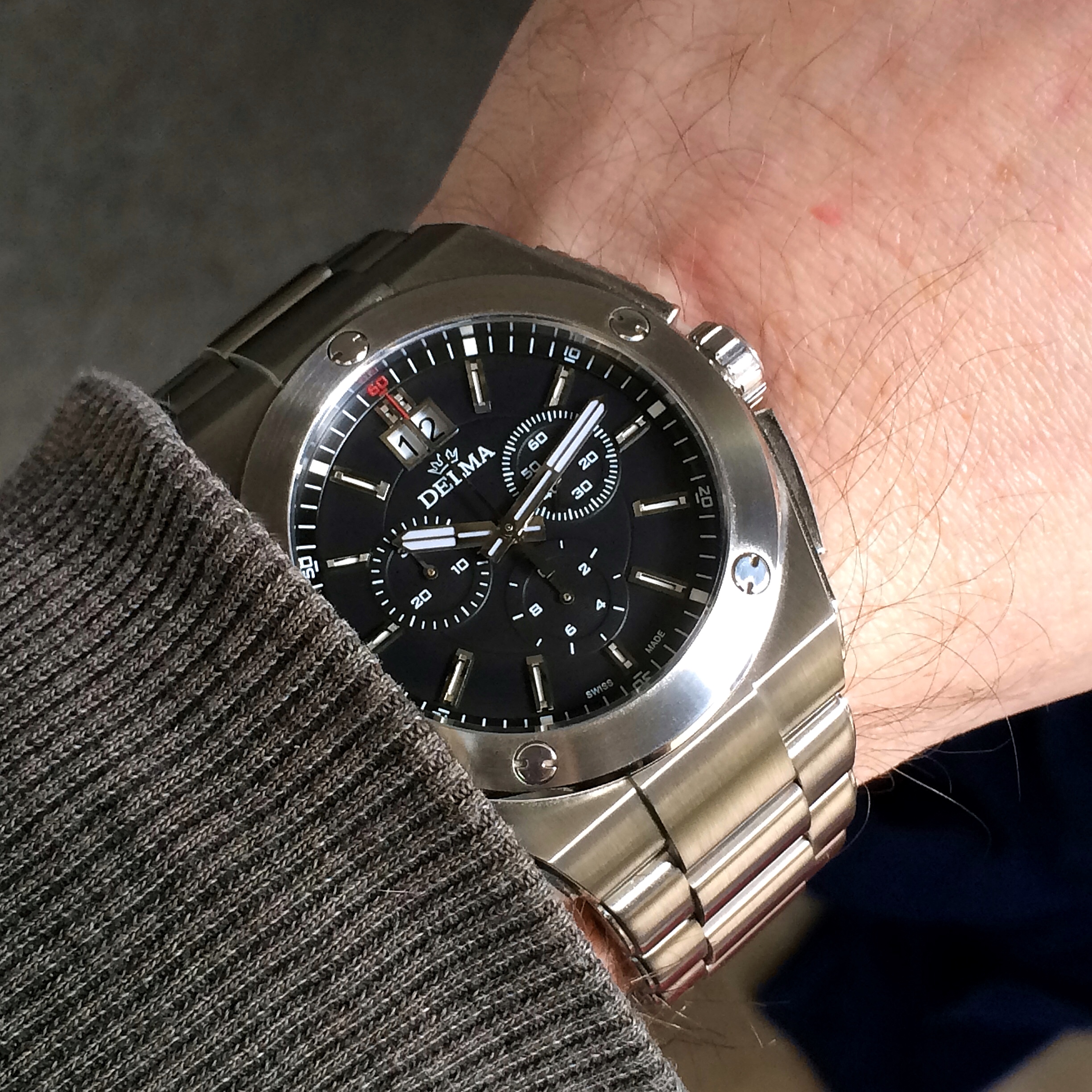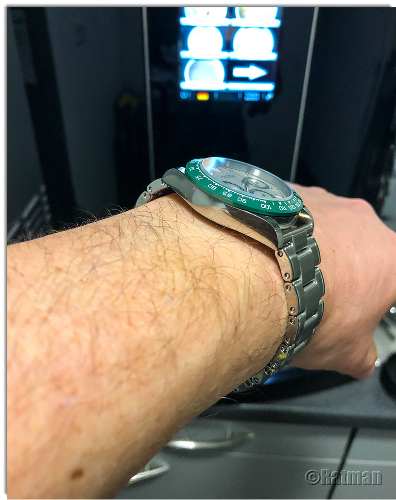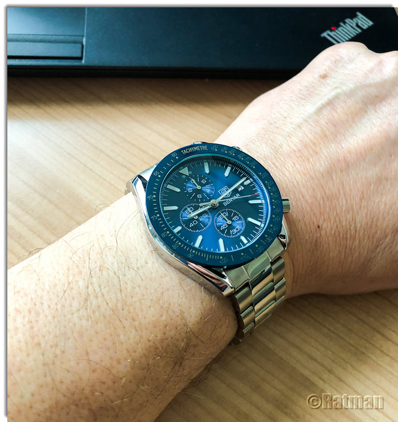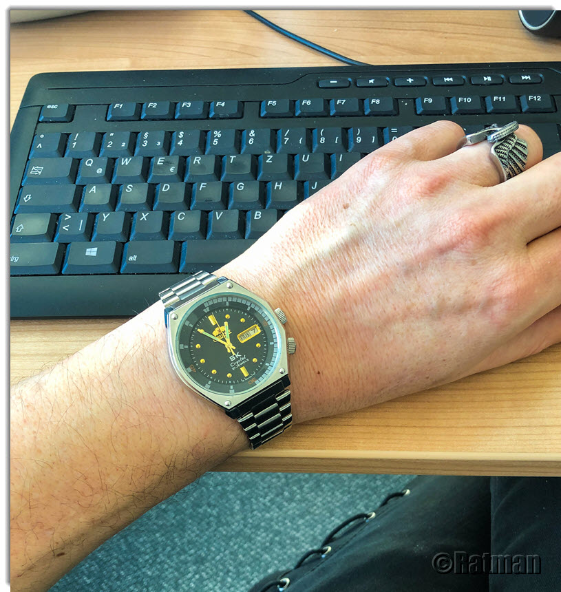 Hab gestern das Band gegen ein Geckota Rivet getauscht. Steht ihr ziemlich gut, wie ich finde. Am Originalband gab es einen typischen Fall von fehlender Qualitätskontrolle. Es fehlten dort schlicht die Aussparungen, in die die kleinen Haken des Verschlusses einrasten. Scheiß drauf, wer trägt bei solchen Uhren schon das Originalband