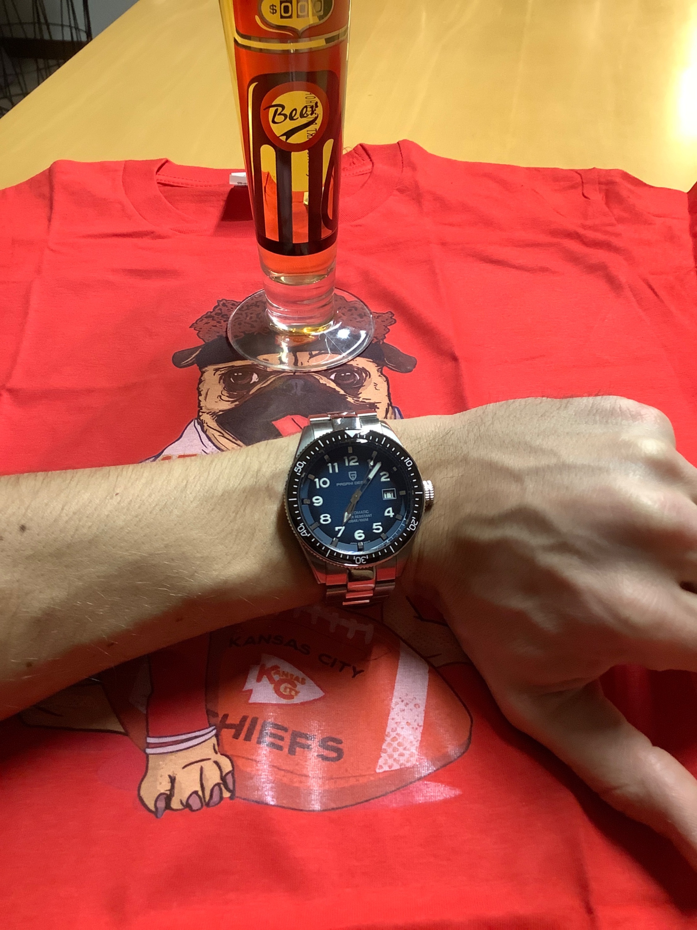 Cooles Shirt, lecker Bier und eine sehr schöne Uhr. Das ist doch mal ein gelungener Tagesabschluss