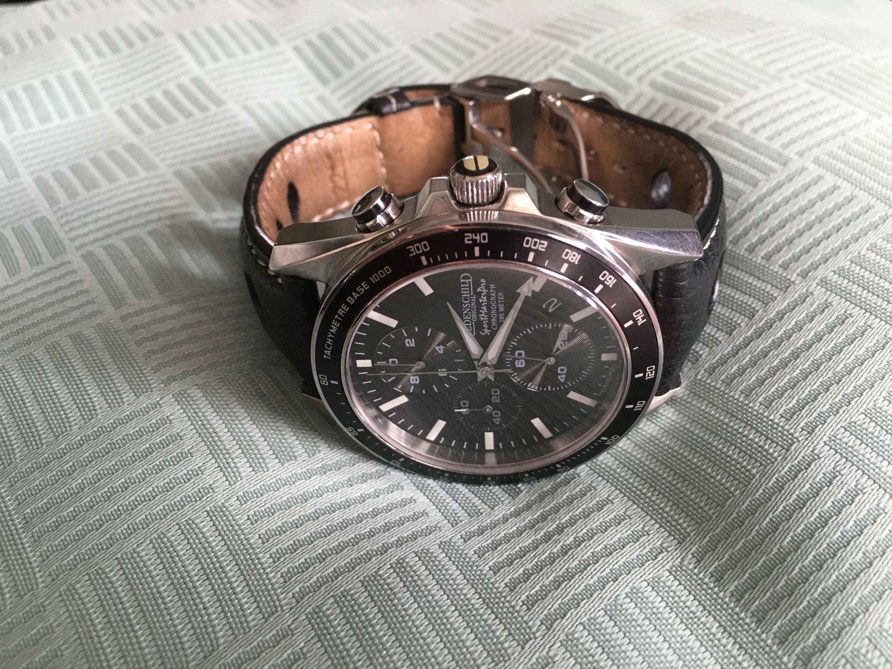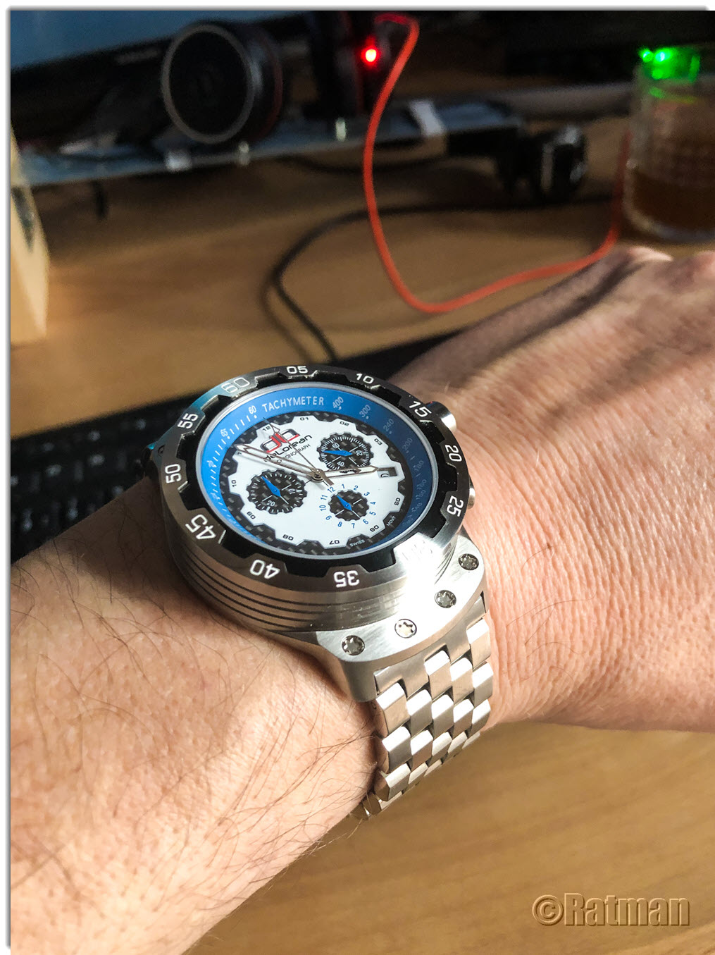 Als die Uhr vorletzte Woche in der Bucht angeboten wurde, habe ich zunächst gezögert. Ich habe ja schon eine sehr ähnliche DeLorean dieser Bauart , die zwar sehr hübsch aussehen, aber eben dieses berüchtigte Millionsmart KalenderChrono-Werk eingebaut haben. Doch dann sah ich, dass die nun angebotene Uhr ausdrücklich als "Chronometer" beworben wurde. Und tatsächlich stand der große Sekundenzeiger auf der 12, so wie es sein soll, und sie hat keinen Toti für den Kalendermonat. "Swiss Mov't" stand außerdem auf dem Blatt. Hm... wie bitte? DeLorean baut auch mal was ordentliches?