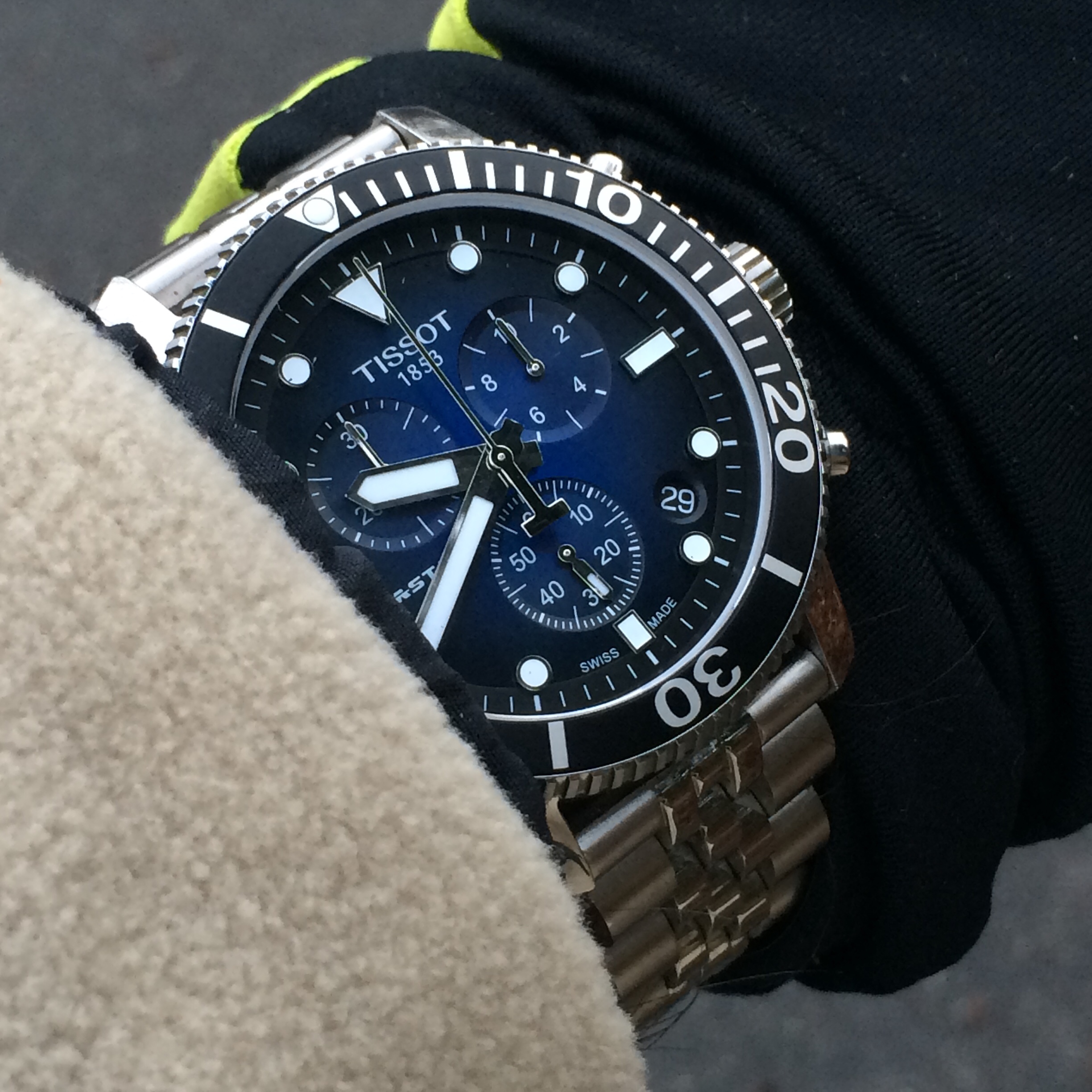 Ich habe bereits das fast baugleiche Modell 0070 mit blauem Zifferblatt. Während bei Letzterer allerdings die Zentralsekunde auch die Stoppsekunde ist, handelt es sich bei der Neuen nicht um einen echten Chrono, da hier die Zentralsekunde immer läuft. Mir isses im Grunde wurscht