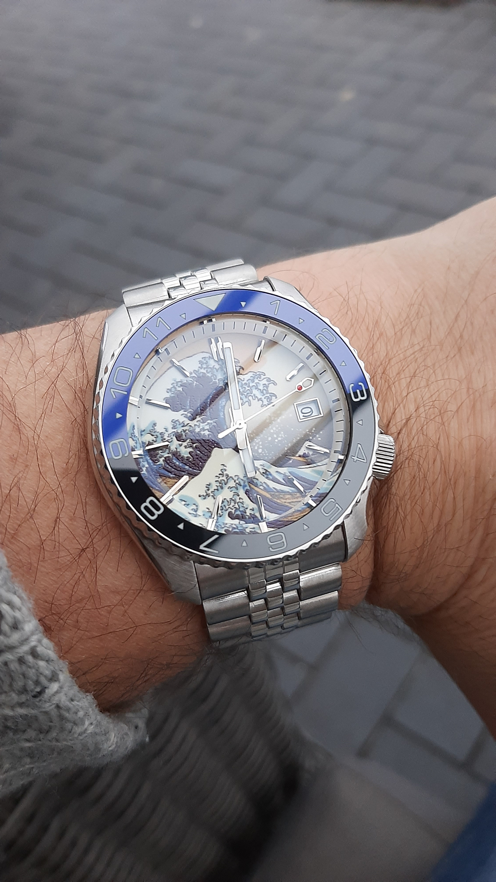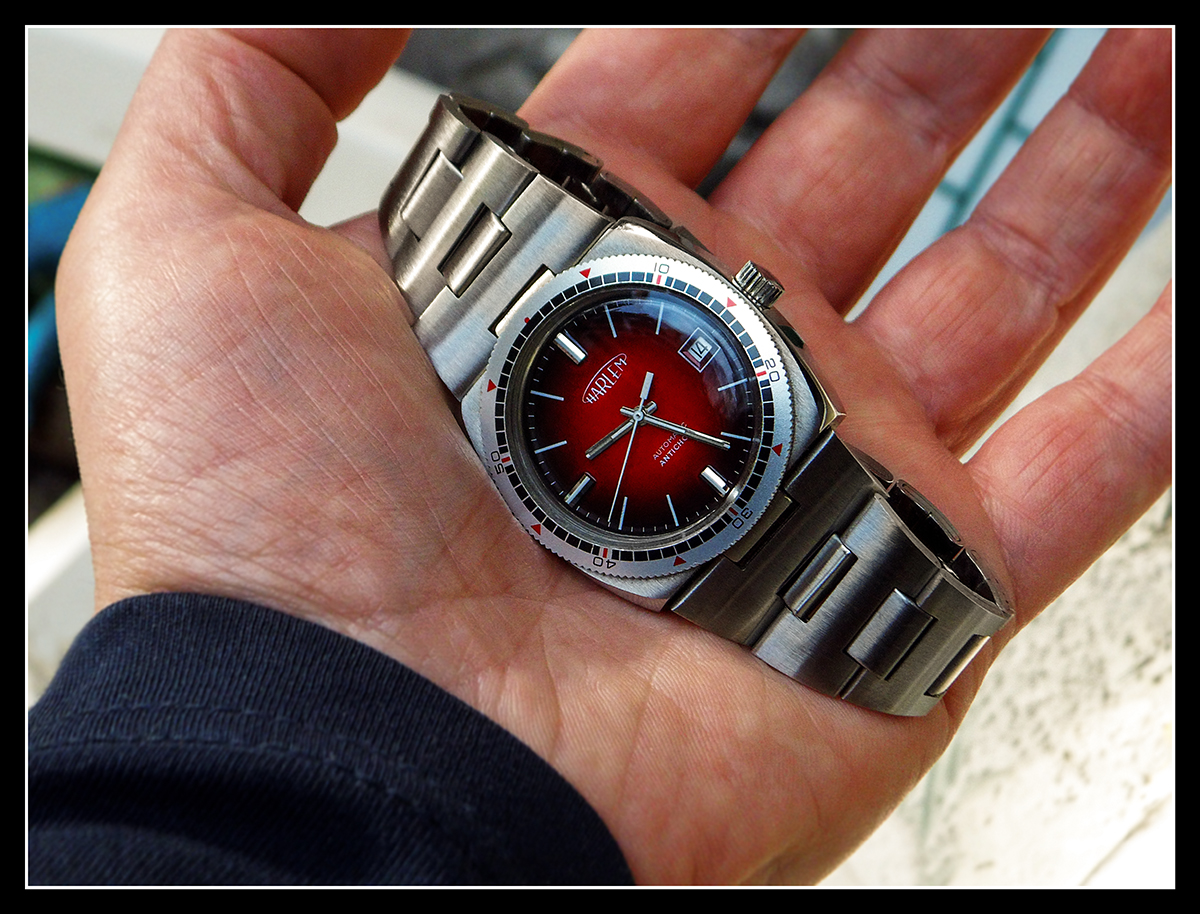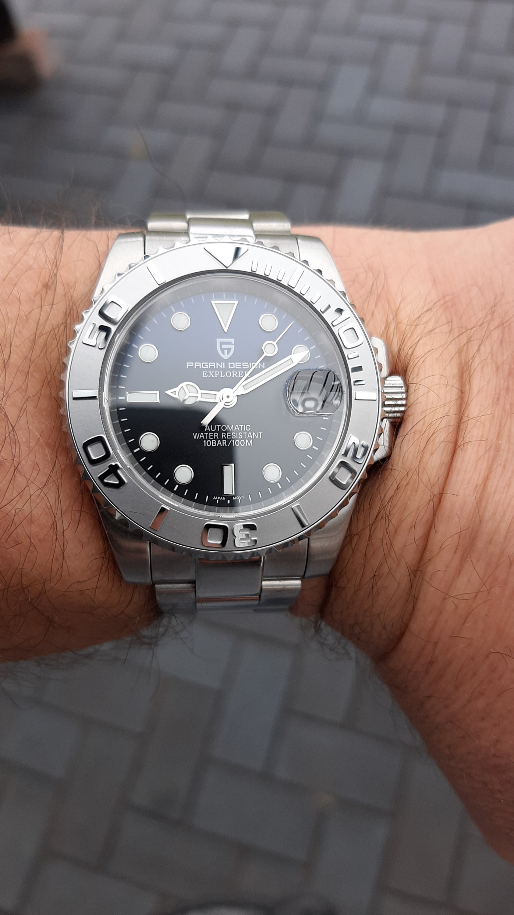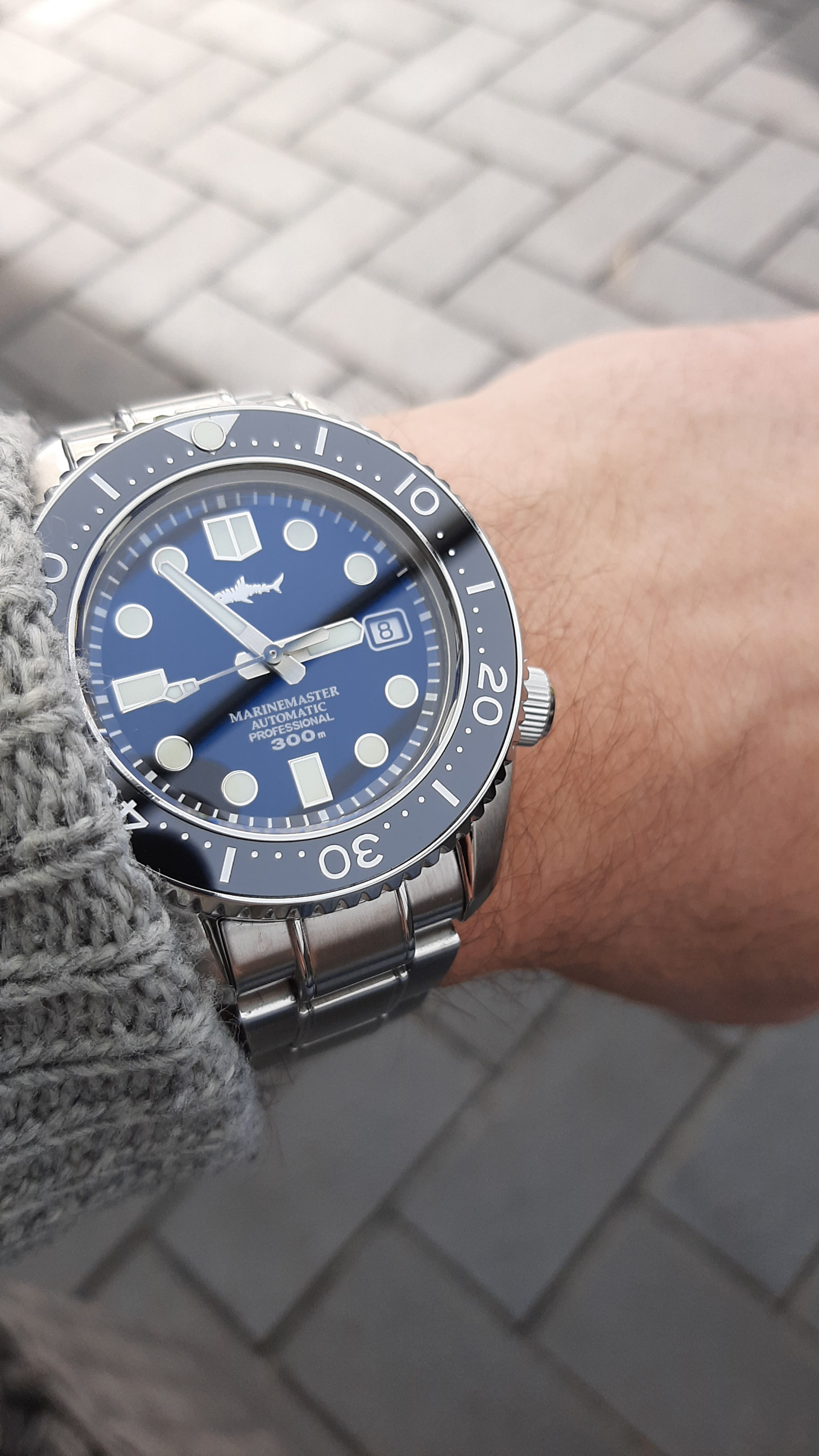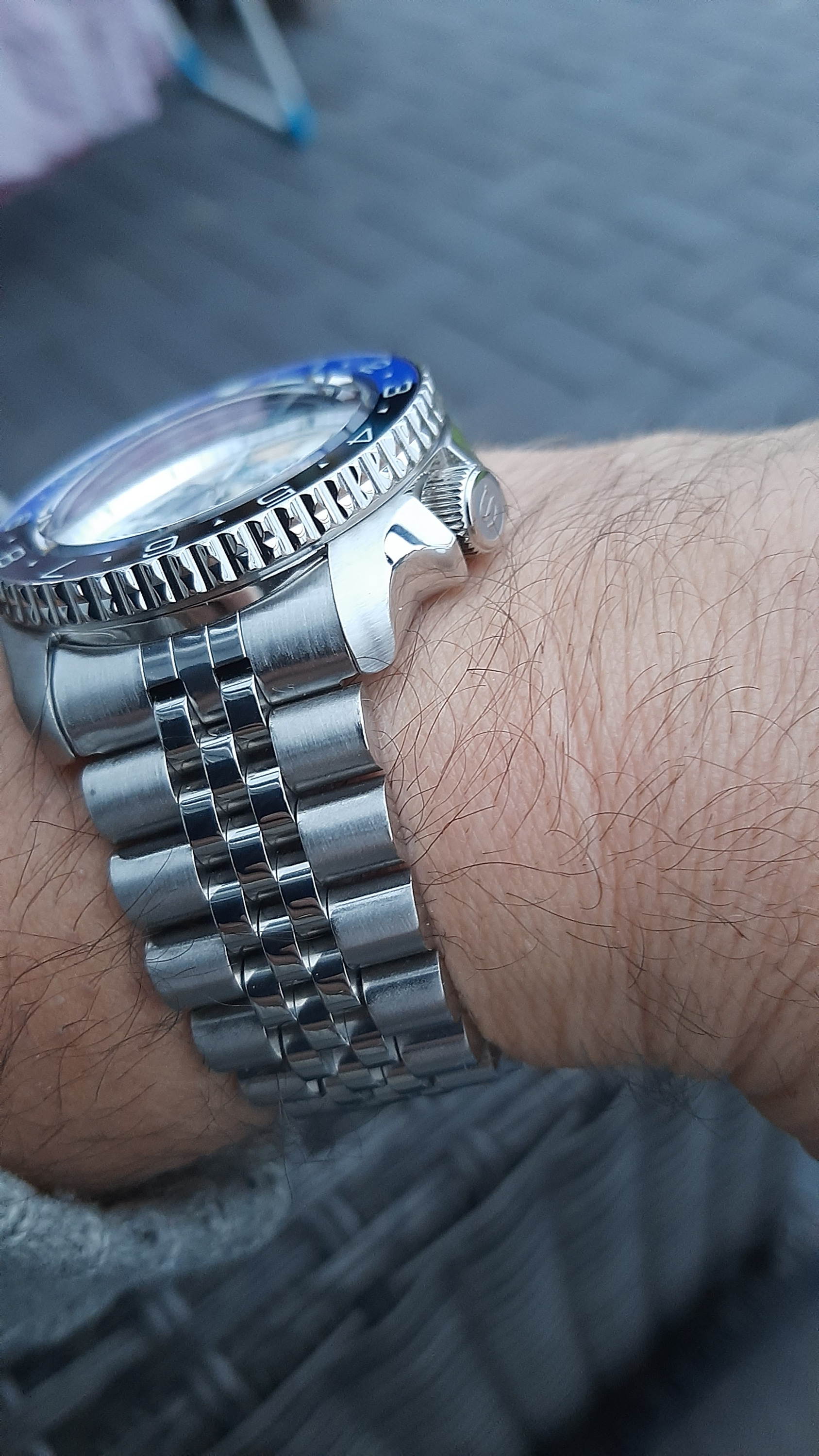 Wird, glaube ich, auch bei Heimdallr produziert und die Uhr selbst ist auch tadellos, aber das Jubileeband ist eher so auf Pagani (oder auch Steeldive?) - Niveau, blech-Endlinks, Blechschliesse und nur gestiftete Glieder mit nicht so tollen Fertigungstoleranzen, soll heißen, es hat neu schon ganz schön Stretch!