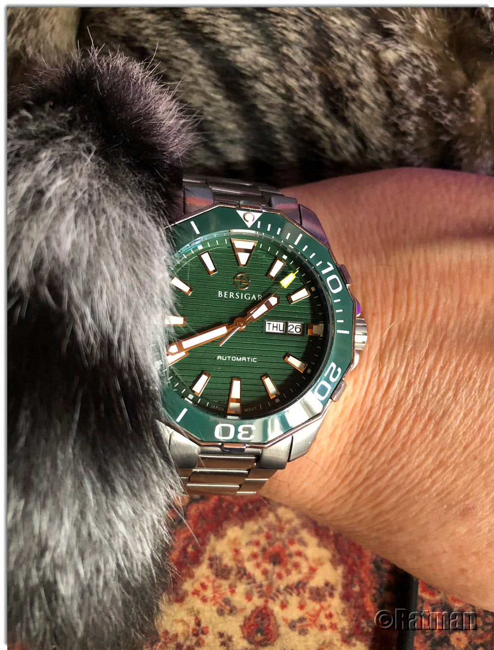Das Armband aus Katzenfell ist echt (und nur kurz von der "Eigentümerin" ausgeliehen), die Aquaracer und der Perserteppich nur fast.