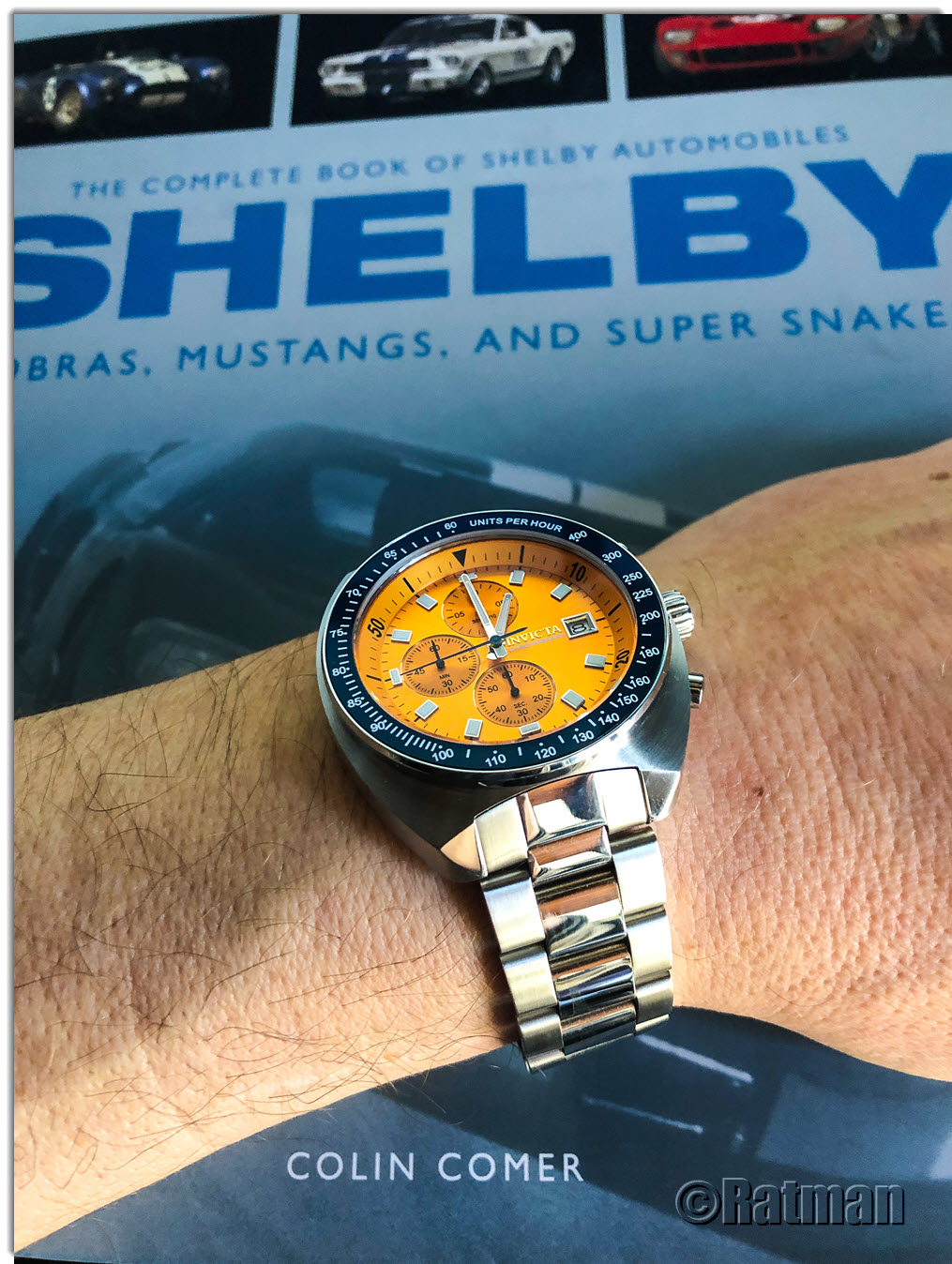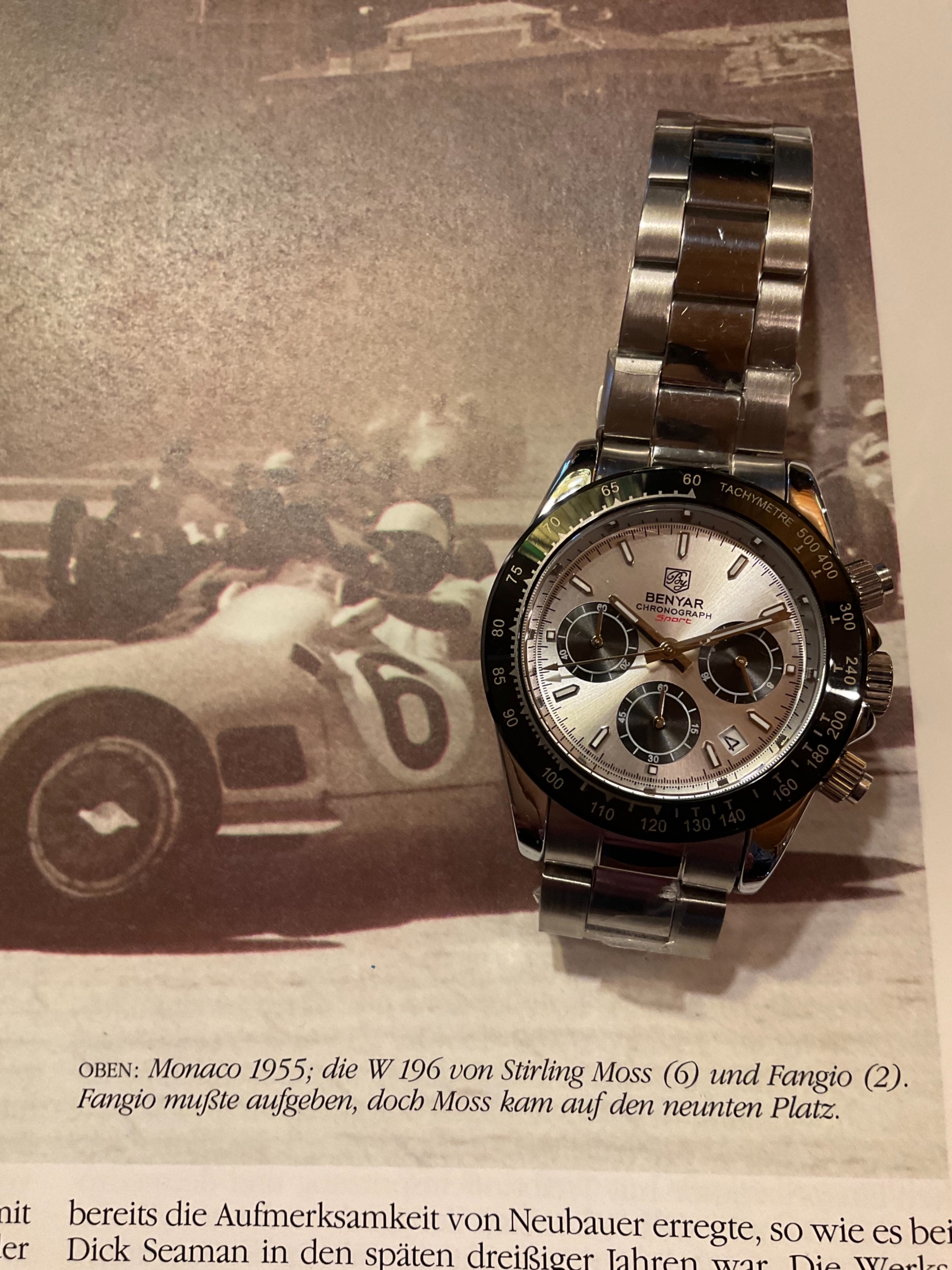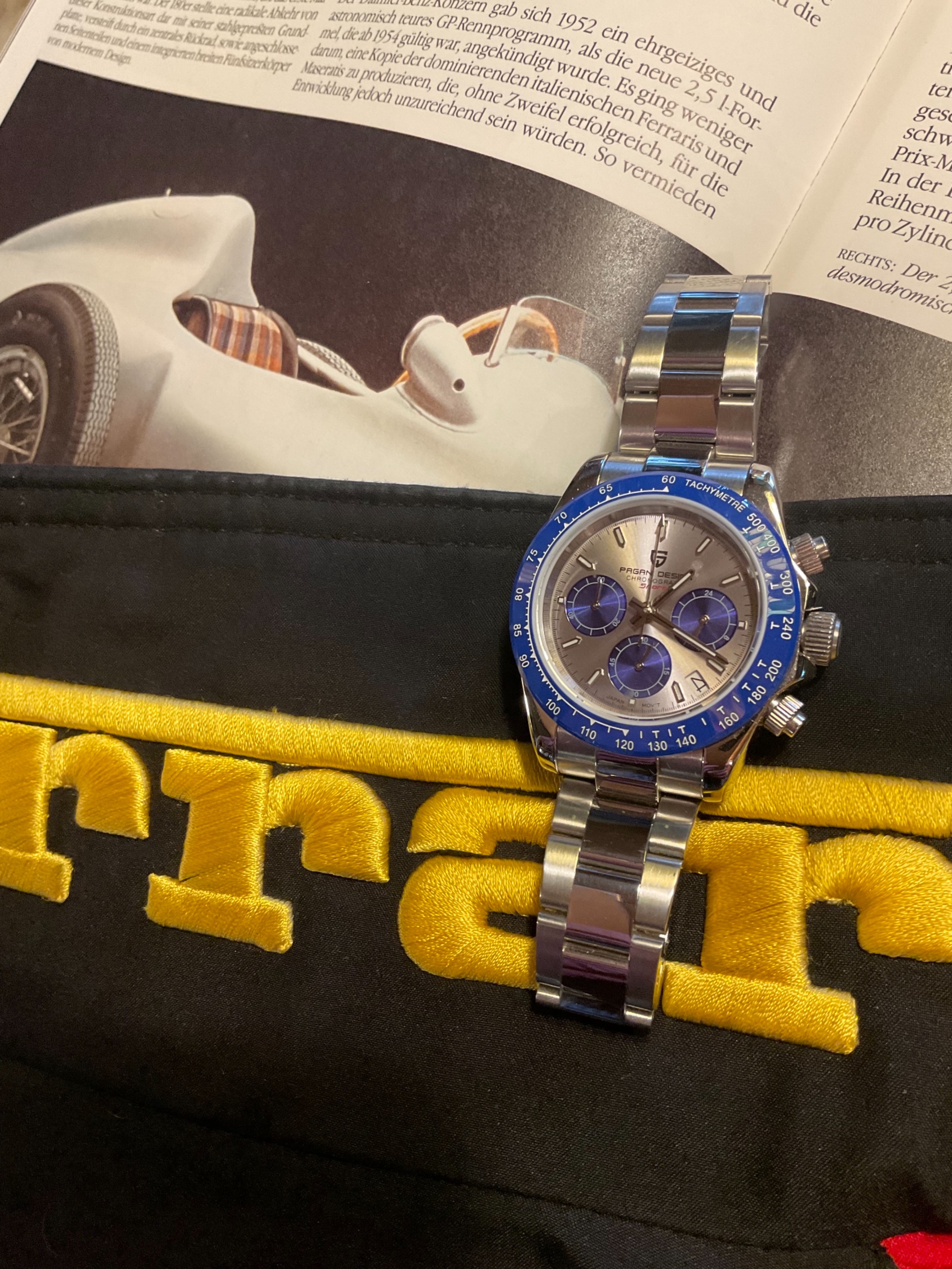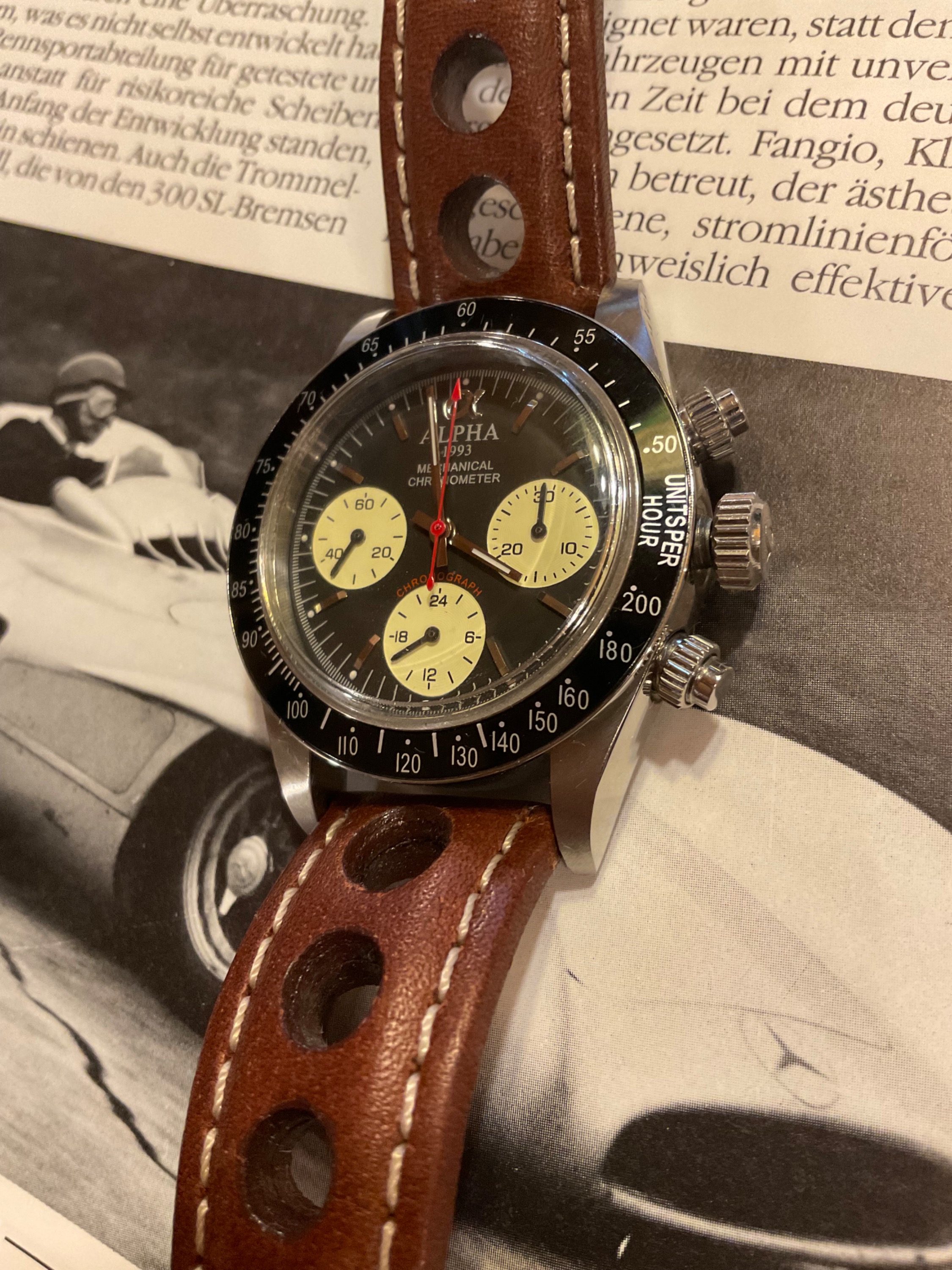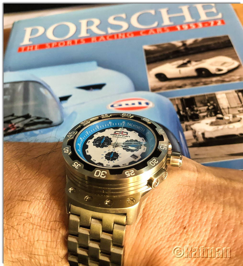 Zurück zum Thema: Heute hab ich mir die Delorean "Piston" an den Arm geschnallt. Man beachte, dass sie ein echter Chrono ist, anders als ihre Brüder mit dem schrottigen Millionsmart Automatik-Werk. Im Hintergrund ein Porsche 917 in GULF Livery