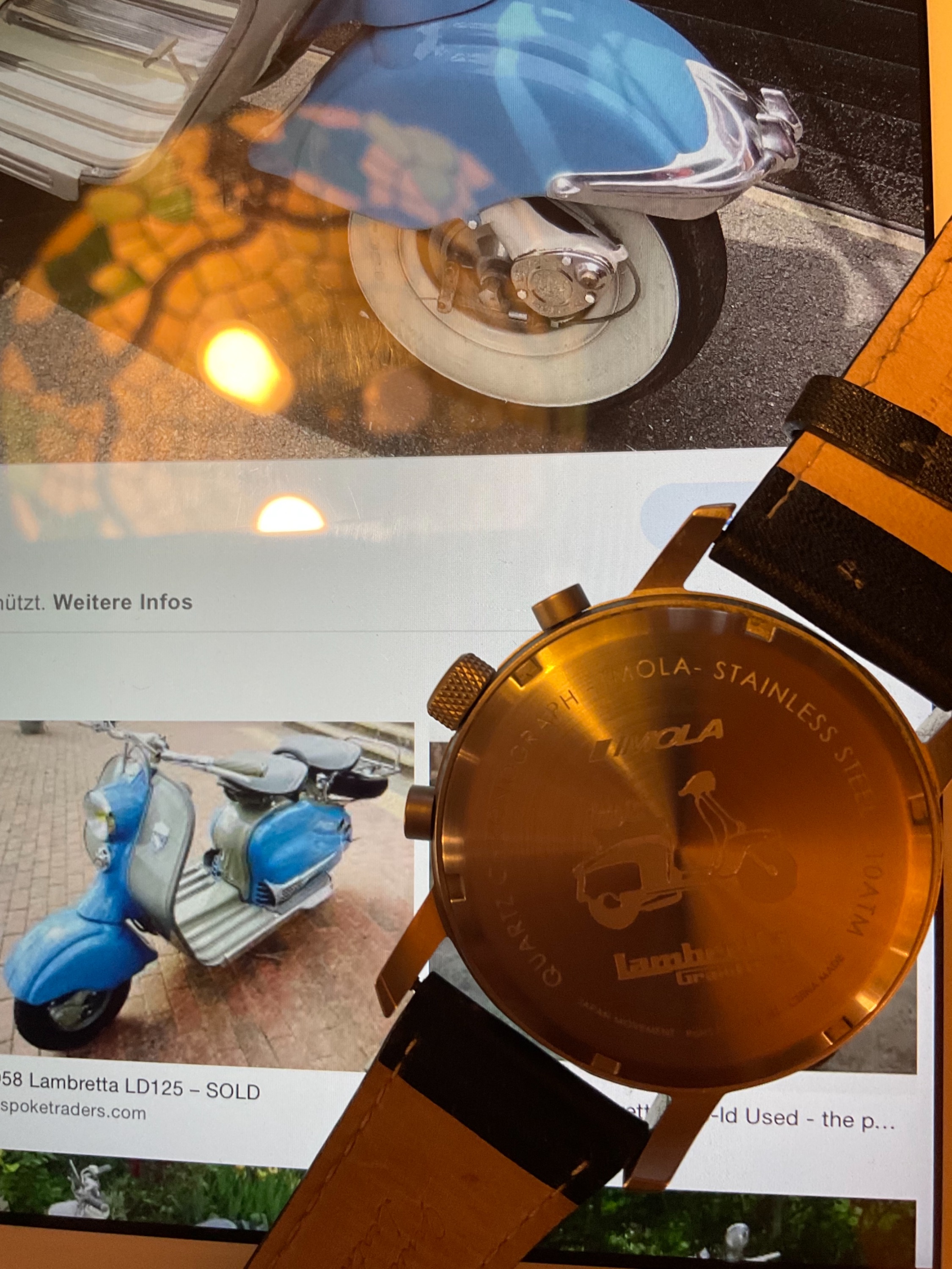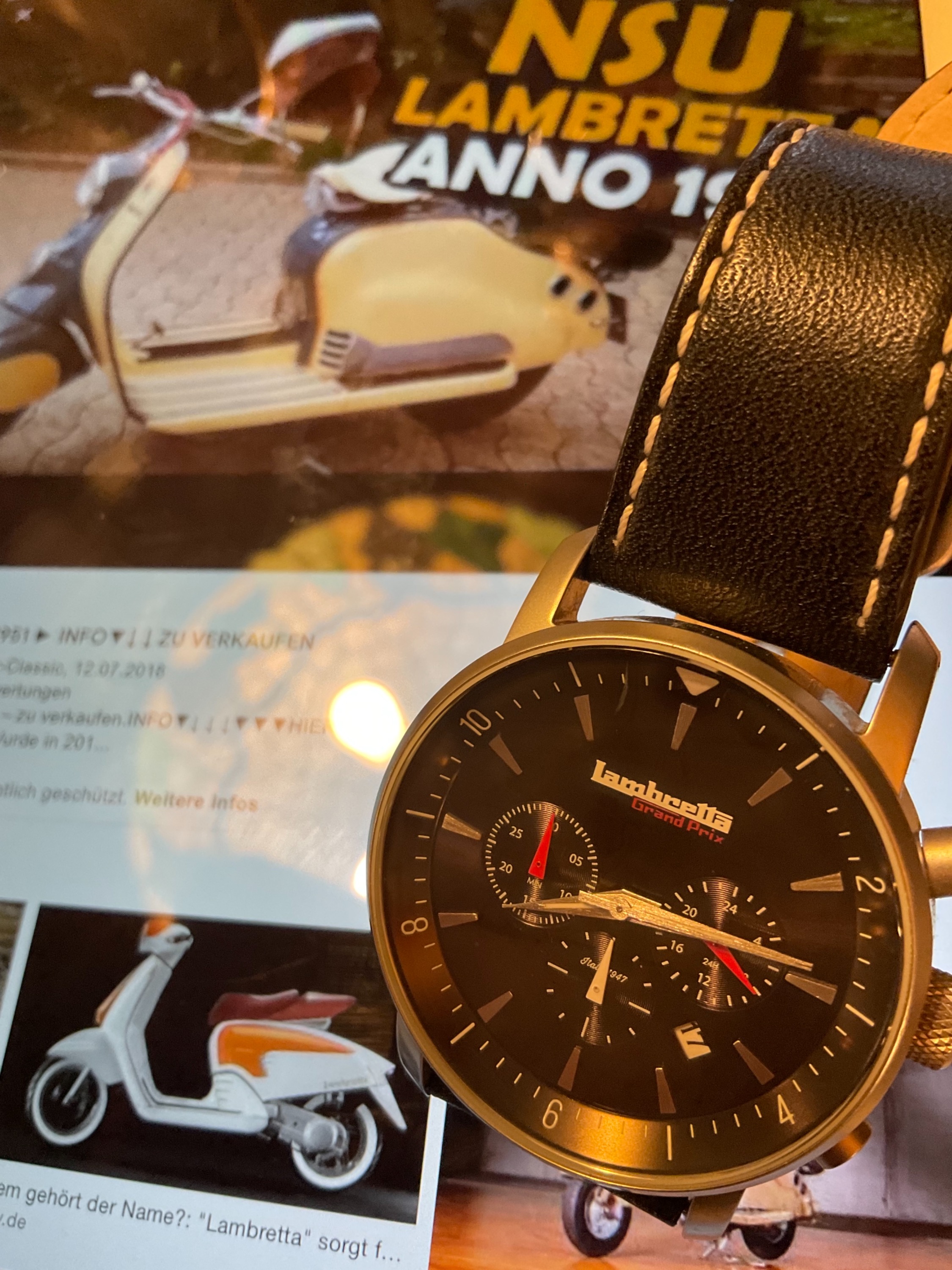 Möchte hier eine doch etwas außergewöhnliche Uhr vorstellen, die eine Hommage an den Lambretta- Roller ist, ich fuhr selber in den frühen 60er einen, bekleidet mit Trenchcoat und Nick Knattertonmütze (!). Stolz mit 72 km/h durch die Gegend brausend, und froh wenn ohne Sturz-bedingt durch das Kopfsteinpflaster und die vielen Straßenbahnschienen, die bei Nässe kriminell waren-ich wieder bei Muttern zuhause war. Habe die Uhr über einen sehr liebenswerten Forianer-ja, sowas gibt‘s auch, und nicht nur einen(!) zu einen Superpreis gekauft. Vermute mal mit den Namen konnte niemand was anfangen.