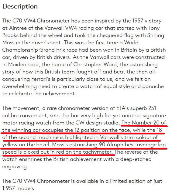 07 Nov. 2021 12:41Ja, auch...aber das "British Racing Green" war ab den 30er Jahren des vergangenen Jahrhunderts traditionell die Farbe der britischen Rennteams, während italienische Teams überwiegend mit rot lackierten Rennwagen antraten ("Rosso Corsa"). Frankreichs Renn-Equipen bevorzugten Blau und die deutschen Teams zeigten sich überwiegend in Weiß, später auch Silber ("Silberpfeile").Das faszinierende an der C 70 Uhr ist ihr Racinggreen, das sind die Farben des britischen Rennstalls Vanwell!