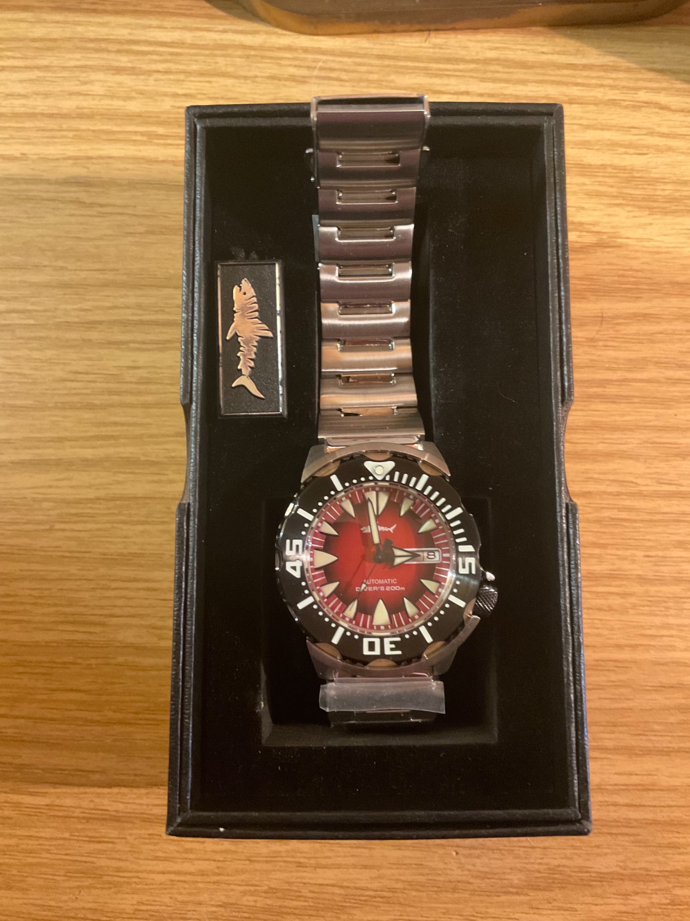 Das personifizierte-im wahrsten Sinne des Wortes- Monster, besser Ungeheuer, habe ich gestern vom Postamt abgeholt. Die Bediensteten atmeten alle befreit auf, denn es hatte sich schon durch die Verpackung durchgefressen und nahm in seiner Gefräßigkeit und Gier alles erreichbare in Angriff! Ob ich dieses Schrecken verbreitende Ungeheuer an das Handgelenk anlege, ich glaube nicht, denn es ist mir wirklich zu schade um meine Hand, die ich ja noch lämger brauche