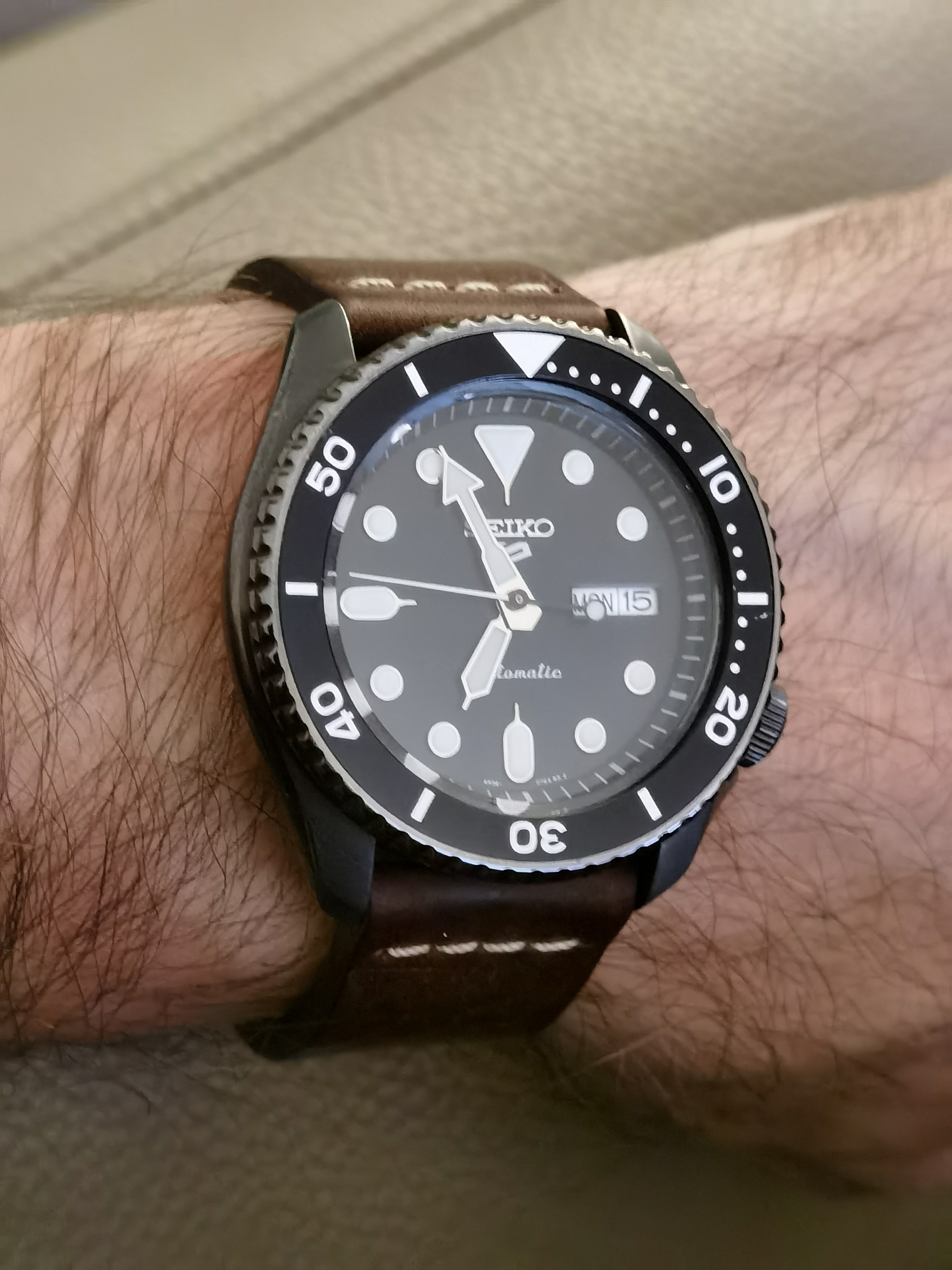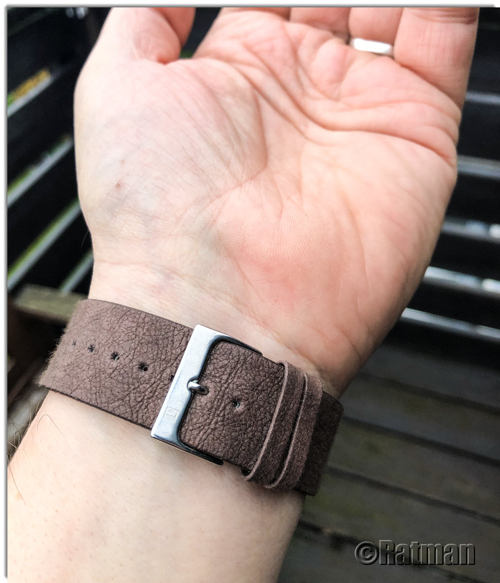 Das neue Band trägt sich sehr angenehm. Anfangs war es ein wenig steif, aber nachdem ich es mal ein wenig gewalkt habe, legt es sich gut ums Handgelenk. Es ist immer noch kein Supersoft-Strap, aber ich habe es zu keiner Zeit als unangenehm empfunden. Und zumindest bei normalen Zimmertemperaturen schwitze ich nicht darunter. Ich trage meine Uhren allerdings auch eher locker.
